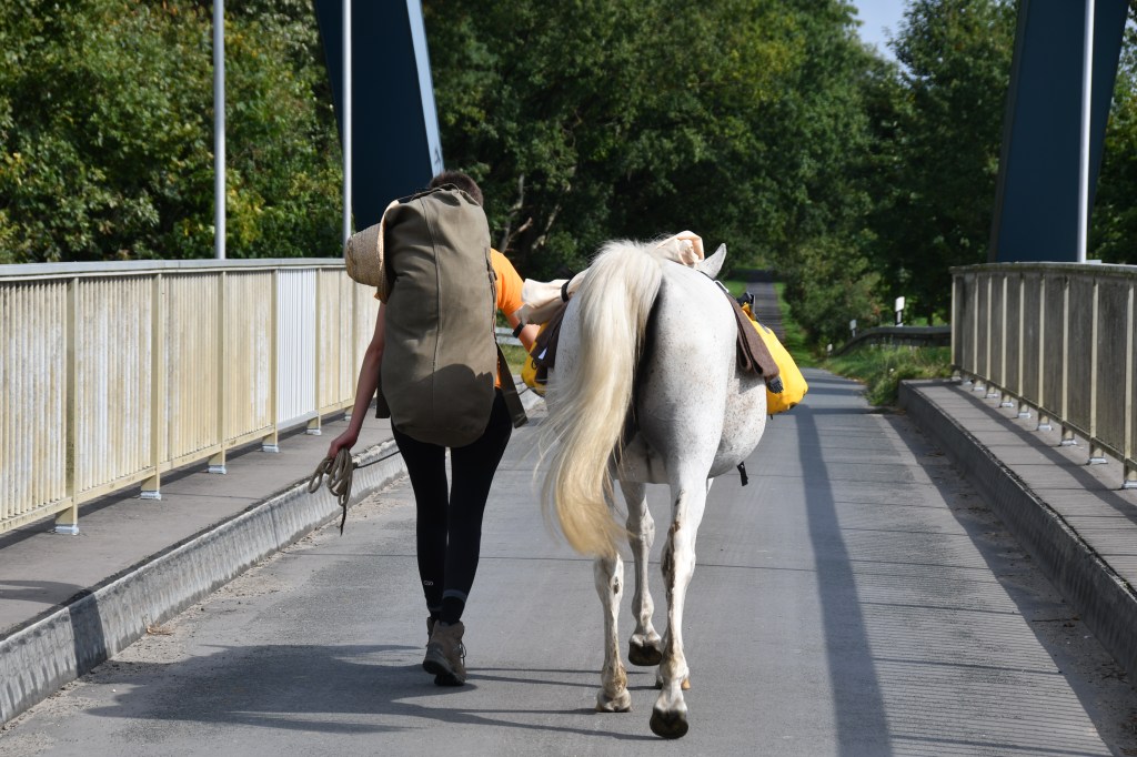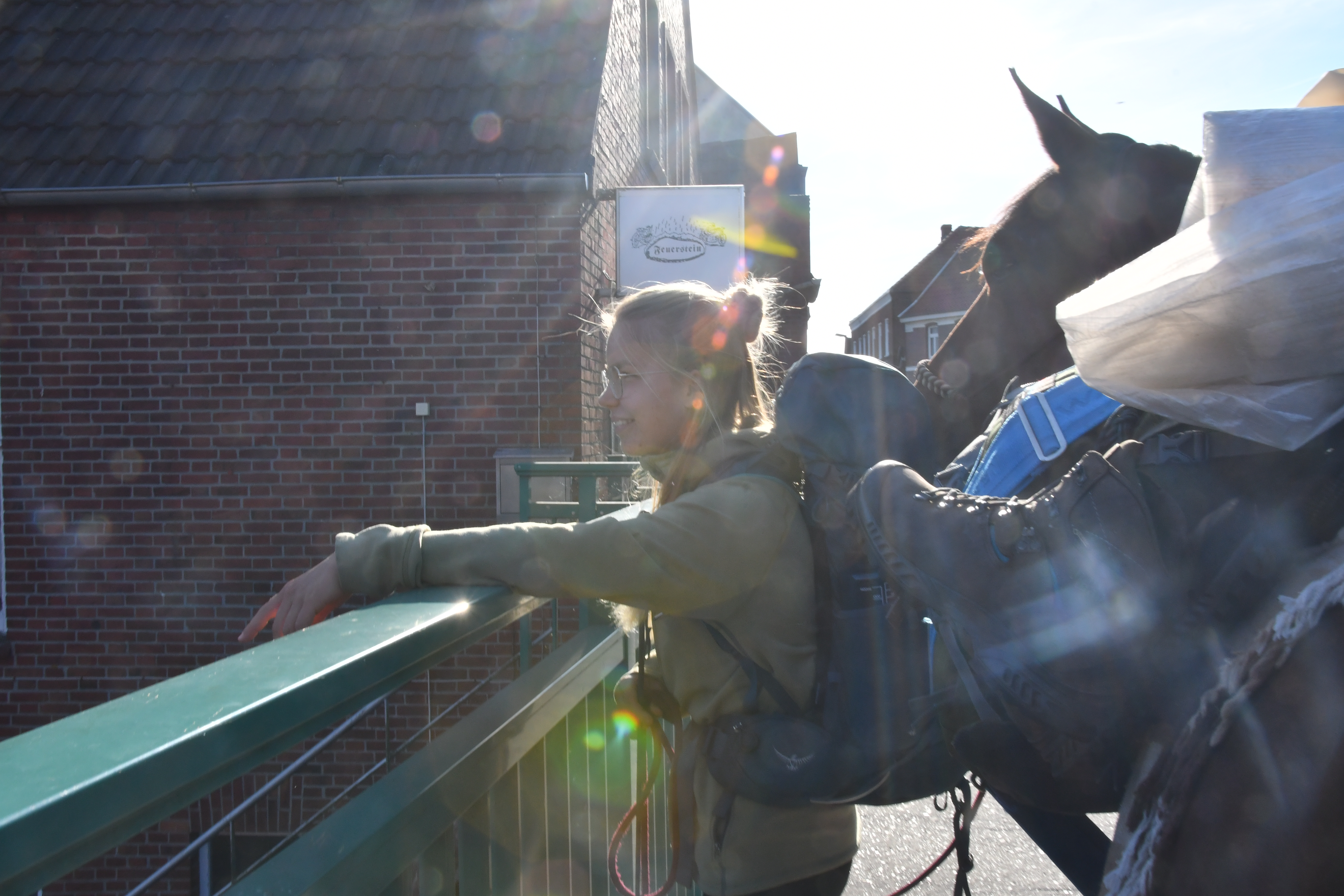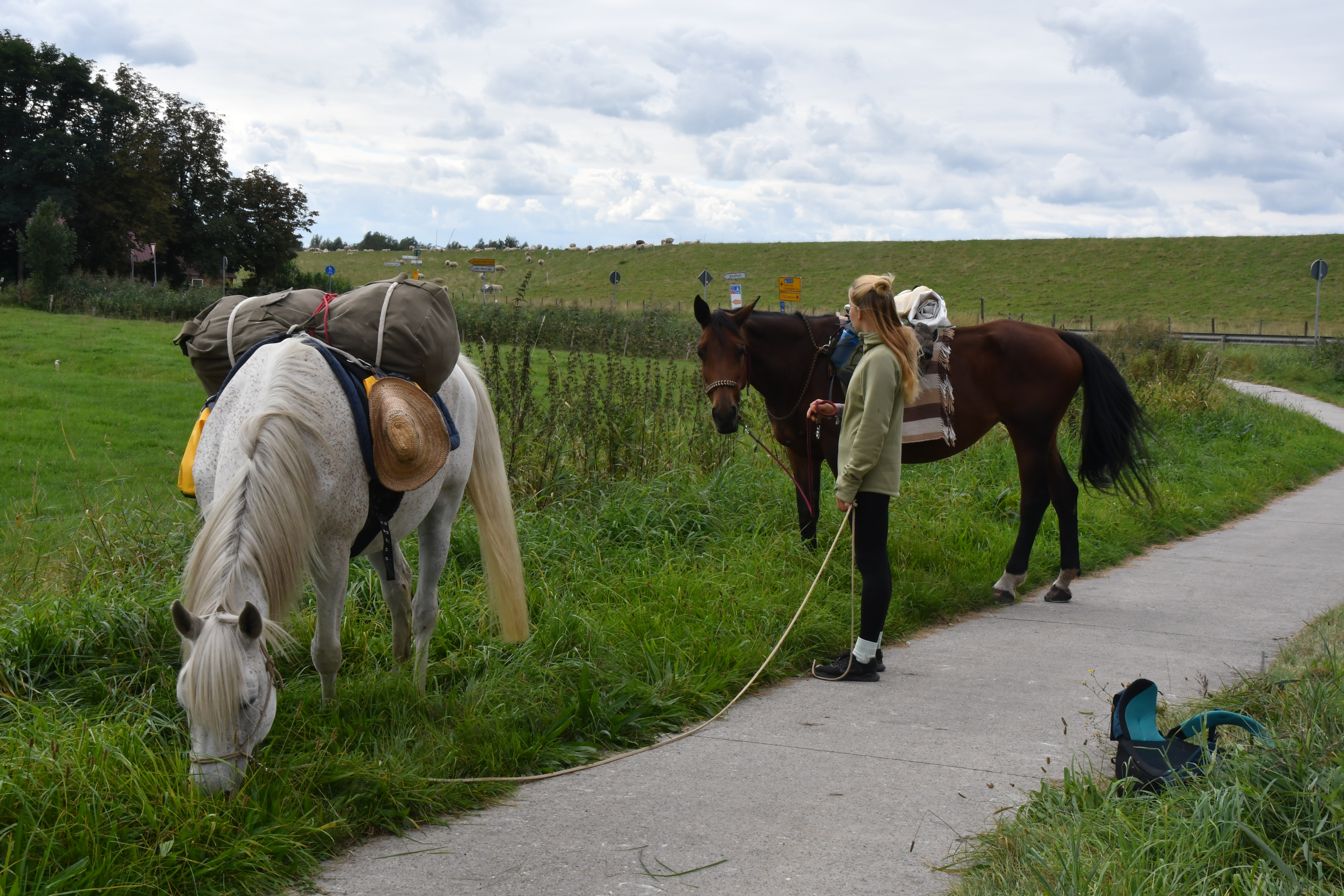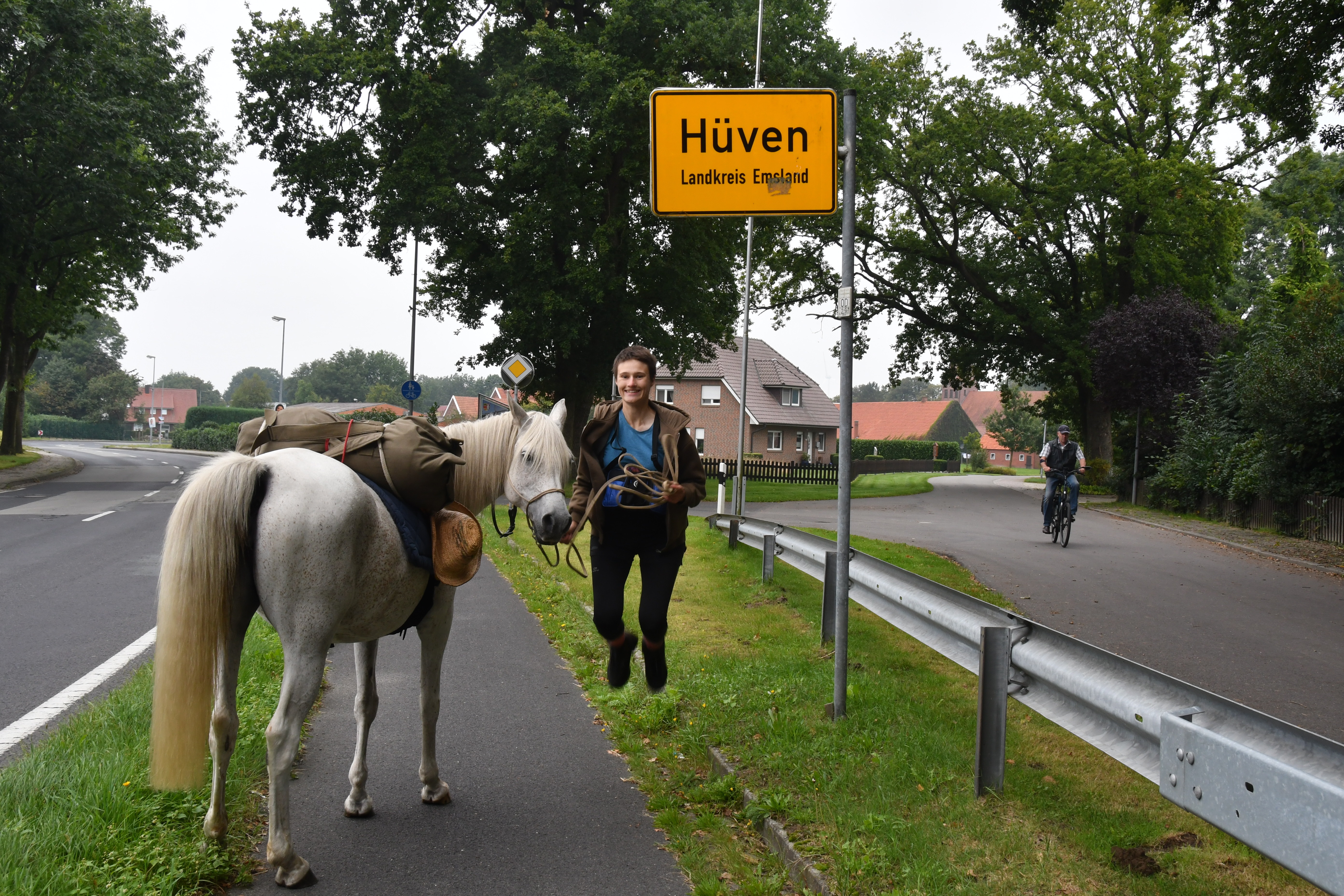 Bei der nächsten Einkaufsmöglichkeit, ein Lidl, stoppen wir und Hannah geht rein um unsere Vorräte aufzufüllen. Als sie zurück kommt, steht Elisa mit den Pferden umringt von einigen Menschen, die sie ausfragen. Wir bleiben einen Moment, unterhalten uns mit den Leuten und gehen dann weiter. Jede noch so kurze Unterbrechung fühlt sich wie Folter an. Elisas Blasen haben sich mittlerweile etwas erholt, dafür tuen Hannahs Blasen nun besonders weh. Wir laufen durch Leer, es ist viel los und dadurch für alle sehr anstrengend. Die Pferde sind zwar ruhig aber wir bemerken, dass wir selbst den ganzen Trubel nicht mehr gewohnt sind und die Ruhe der Tage zuvor vermissen. Es geht über eine Brücke und dann in ein Wohnviertel. Der Verkehr nimmt merklich ab. Bevor wir den nächsten Feldweg erreichen, laufen wir an einer Grundschule vorbei. Es ist gerade Pause, die Kinder schreien alle durcheinander, wir sind unfreiwillig die Tagesattraktion und machen uns schnell davon. Endlich wird es grüner. Wir machen an der nächsten Wiese direkt wieder Pause, nur 3 km nach der letzten aber die Köpfe qualmen. Uns besucht eine Frau mit Hund und erzählt von ihrem verstorbenen Islandpony. Sie wollte immer schon genau so eine Tour wie unsere mit ihm gemacht haben. Dass sie es nie getan hat, scheint sie bei unserem Anblick enorm zu bereuen. Ihre Reaktion zeigt uns erneut, dass es die richtige Entscheidung war die Reise nicht aufzuschieben sondern drauf los zu wandern.