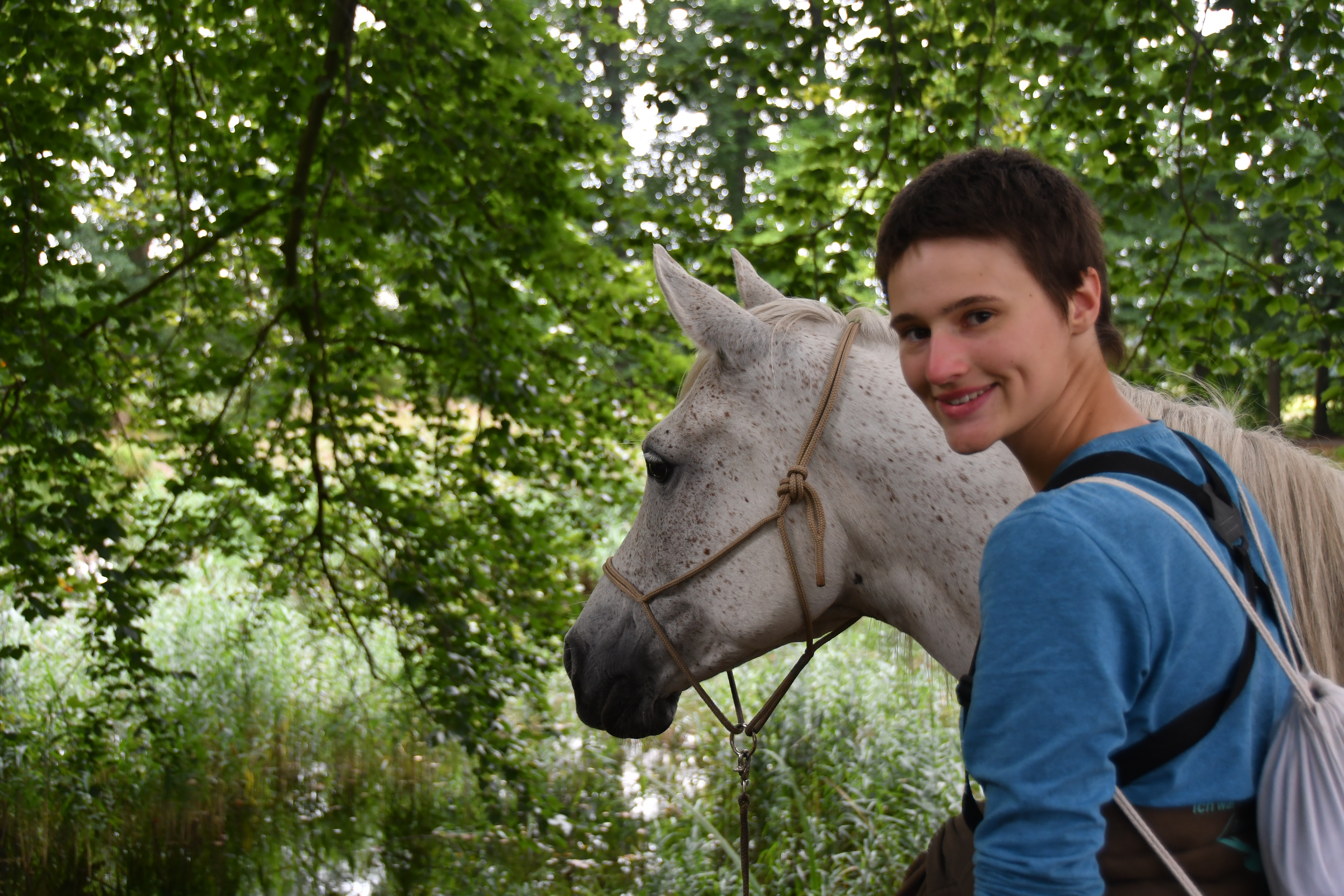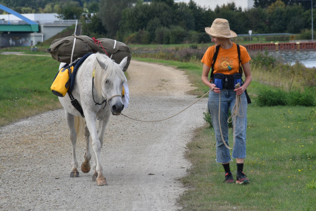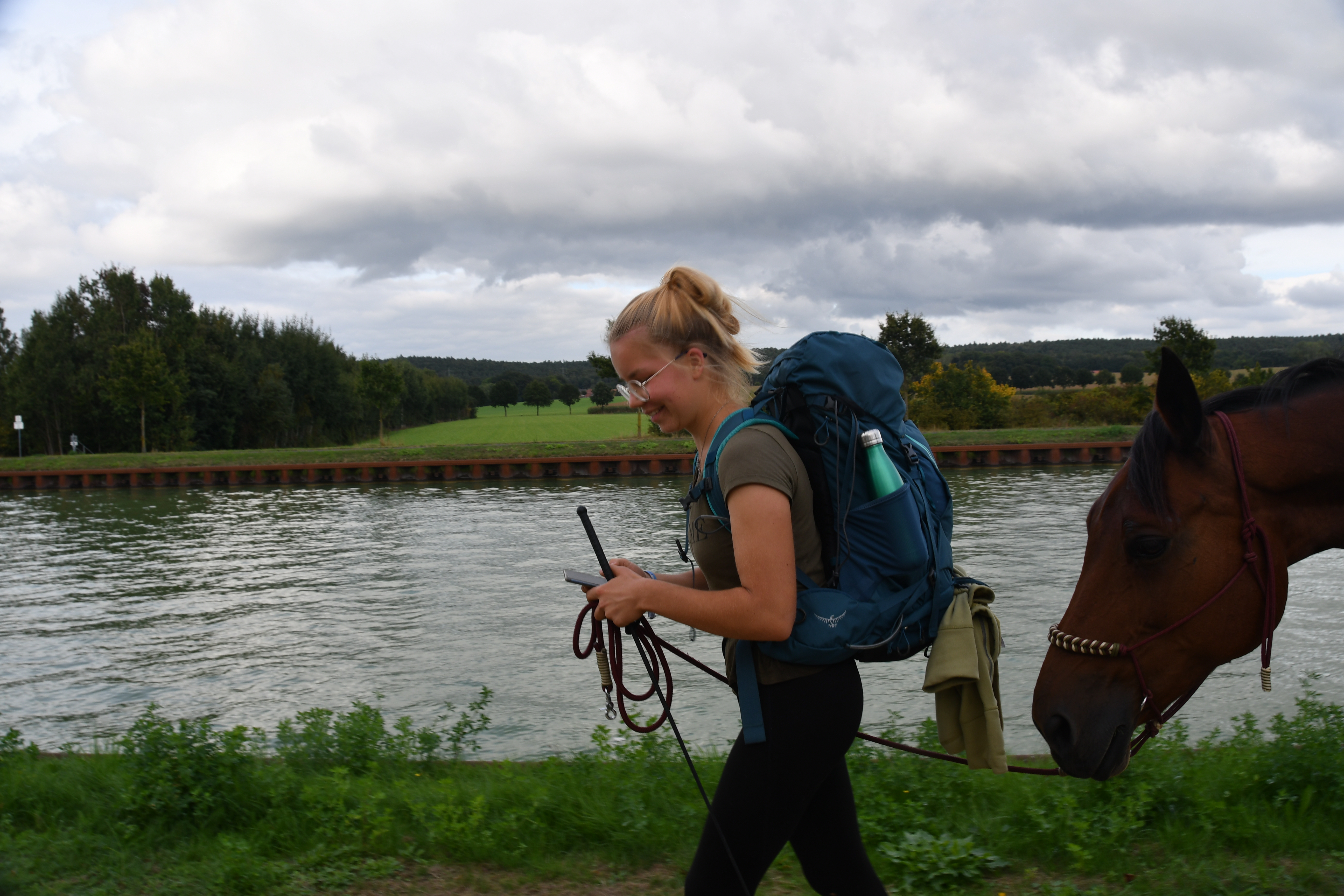 An diesem Tag verrutscht der Packsack gleich zweimal. Dennoch geht es Phoebe nach dem Wechsel ihrer Satteldecke merklich besser und auch ihre panische Reaktion nimmt ab. Sie hat gelernt, dass wir gleich zu Stelle sind und ihr helfen sobald der Sack ins Rutschen kommt. Hannahs Muskeln verkrampfen sich gehäuft, wir müssen viele Pausen machen, in der sie Dehnübungen macht. Die Strecke fängt an sich zu ziehen. Es werden Brücken gezählt, nach 7 soll es endlich weg vom Kanal gehen, wir können es nicht mehr erwarten. Der Weg ist fast nur geradeaus und eintönig. Spannend wird es nur durch vorbeifahrende Schiffe und einem Hafengelände auf der anderen Kanalseite. Der Himmel ist wolkenlos, die Bäume am Rand tragen gegen die Sonne nur wenig zur Abhilfe bei. So schlägt Hannah schließlich vor in der großen Pause im Kanal schwimmen zu gehen. Der Vorschlag trifft zunächst auf Skepsis und wird im Nachhinein als „glorreich“ bezeichnet. Das Bad tut uns beiden sehr gut. Leider mussten wir uns mit dem Festhalten der Pferde abwechseln, sodass es von dem ersten Kanalbad Elisas keinen Beweis gibt.