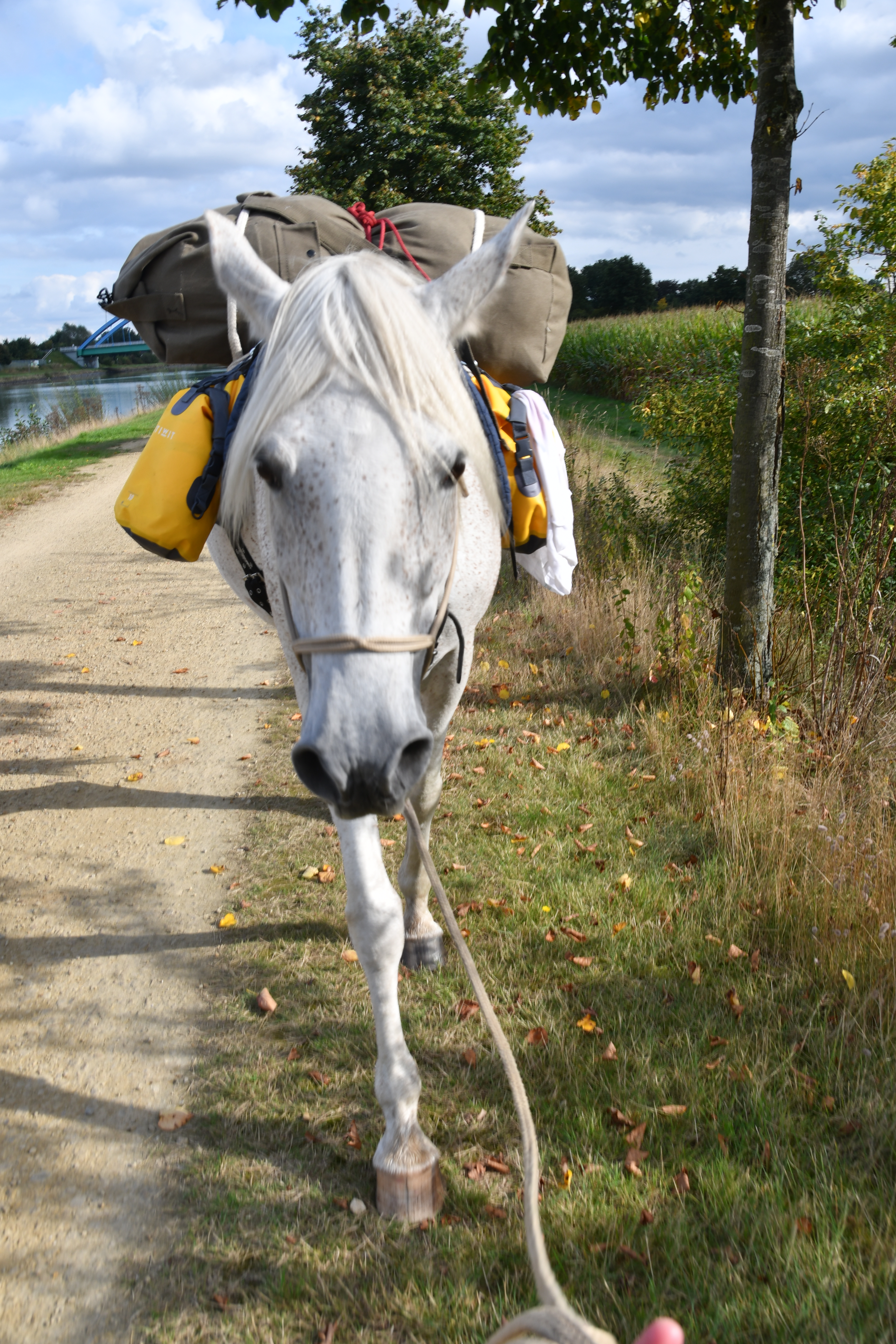 Da wir nicht mehr am Kanal entlang laufen, haben wir auch keine ständige Wasserquelle mehr zum Füllen des Falteimers und Tränken der Pferde, sodass uns unterwegs nichts anderes übrig bleibt als bei einem Bauern anzufragen. Dieser zeigt sich als sehr verständnisvoll und nett und füllt den Eimer bis bei beiden Damen der Durst gestillt ist.