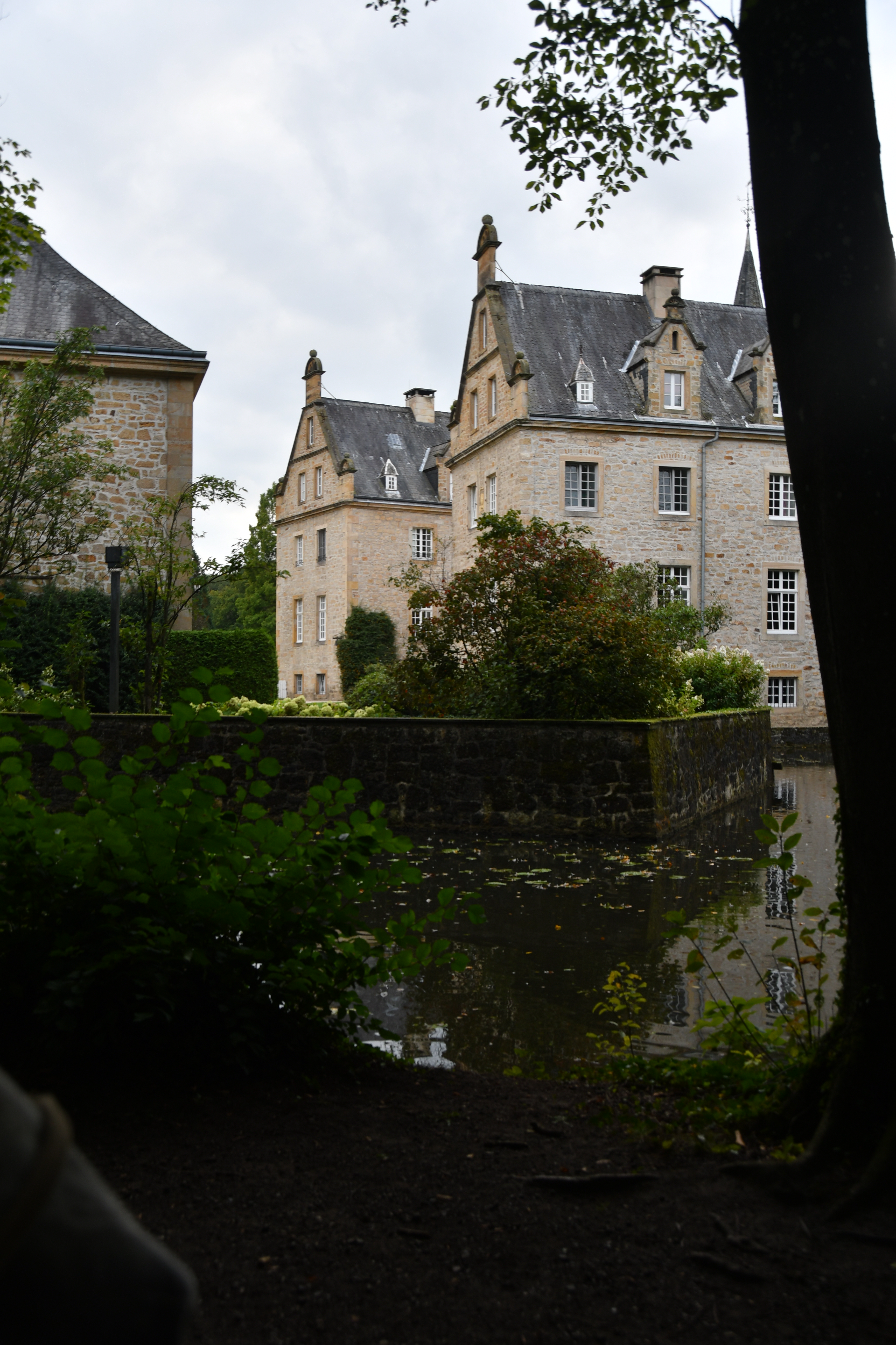 Endlich wieder auf dem richtigen Weg, geht es ein Stück die Landstraße entlang bis in einen Wald, der an einem Schloss vorbei führt. Der Wald wirkt bezaubernd, die Muskel- und Fußschmerzen sind verdrängt. Das Schloss liegt inmitten eines Teichs mit Seerosen und Enten. Außer uns ist niemand dort.