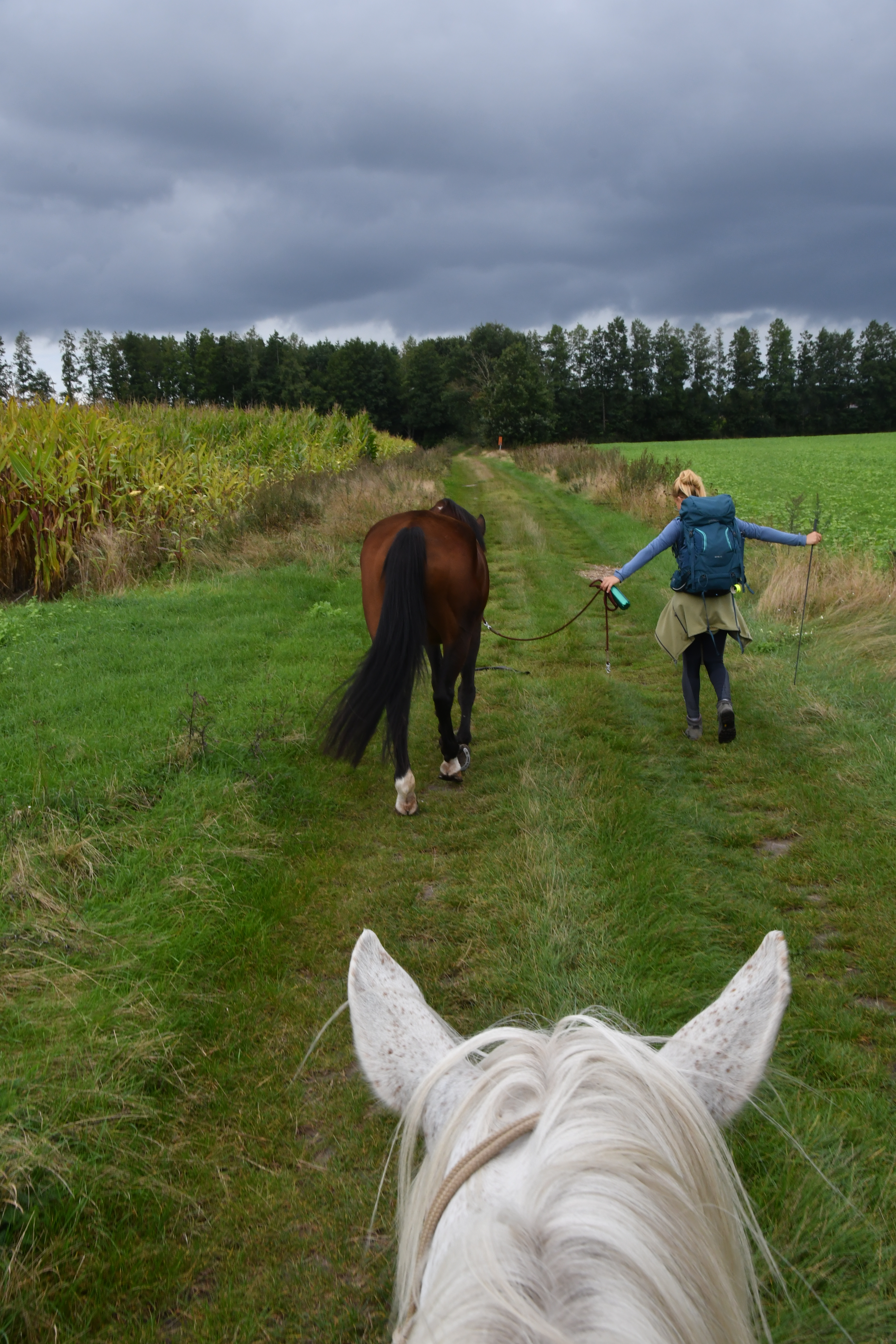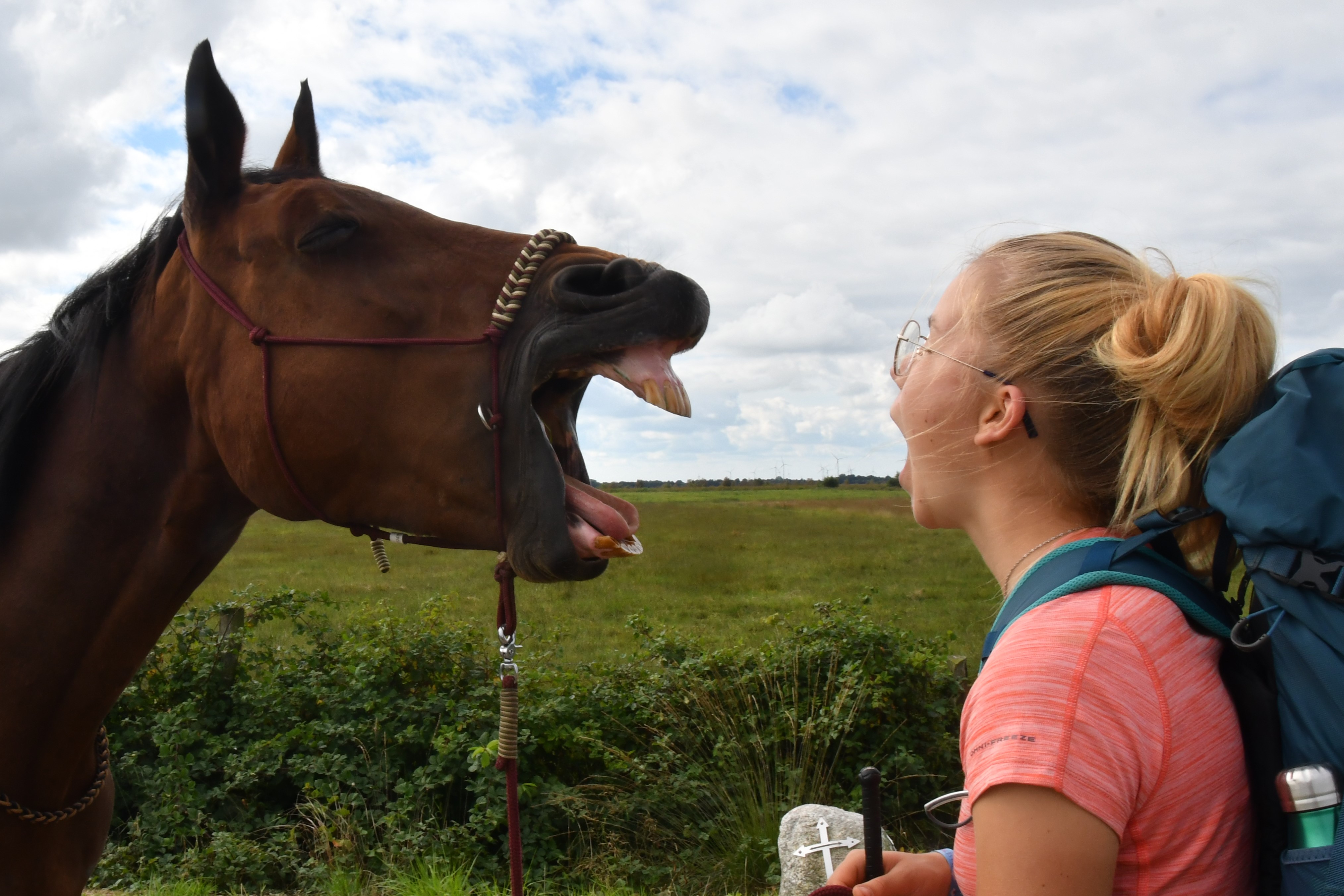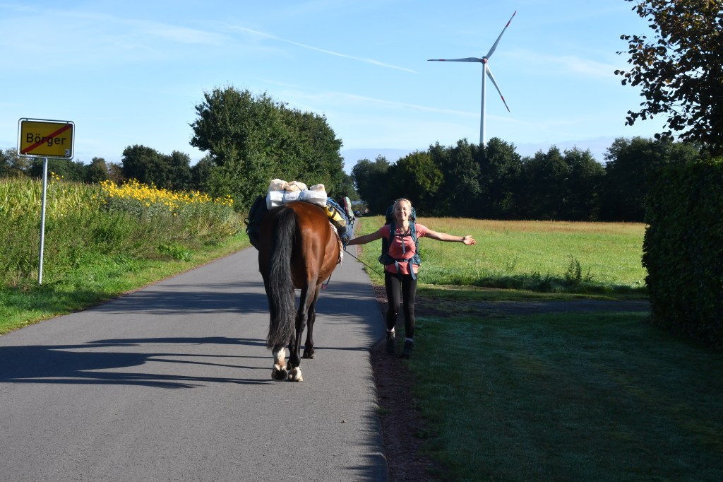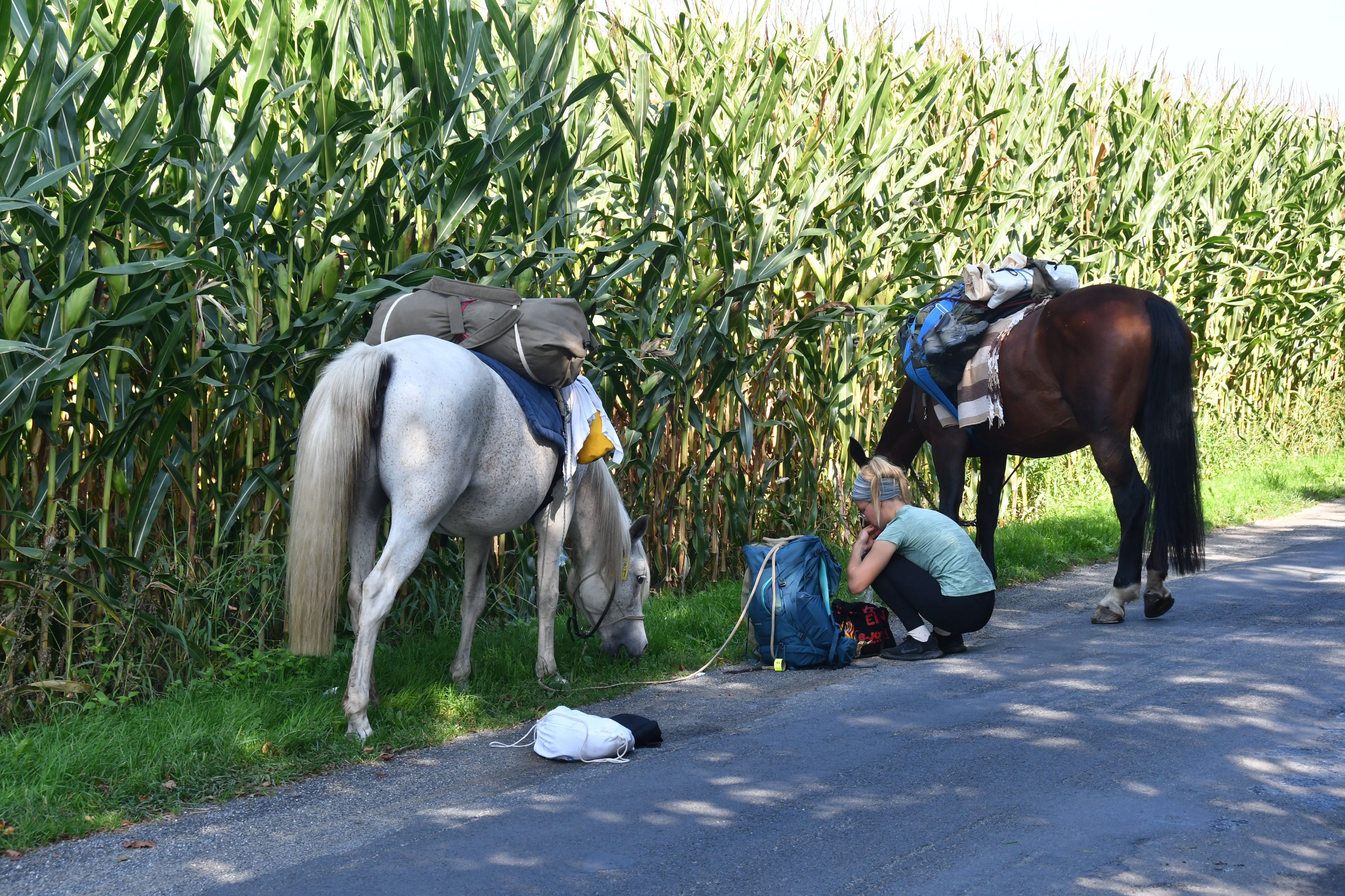 Frustriert verlässt sie die Praxis und ärgert sich darüber für das Gespräch insgesamt eine halbe Stunde Zeit verloren zu haben. Elisa musste während der ganzen Zeit beide Pferde bespaßen ohne dass sich die beiden Stricke verknoten – keine leichte Sache! Unsere Laune ist zu diesem Zeitpunkt auf Rekordtief. Zu allem Überfluss führen die nächsten Kilometer nur geradeaus an einer Landstraße entlang. Phoebe läuft sehr langsam, vermutlich hat sie Muskelkater, Hannah macht sich Sorgen um sie. Das Gepäck wird noch einmal abgenommen und umgepackt. Bei Hannah beginnt eine Art Trance, sie erinnert sich im Nachhinein an die folgenden Kilometern nicht mehr, auch weil dieser Tag schmerztechnisch am intensivsten war. Elisas Laune bessert sich hingegen regelmäßig, ihr tut das dumpfe Laufen gut. Und dazu freut sie sich auf das Widersehen mit ihrer Patentante A. .