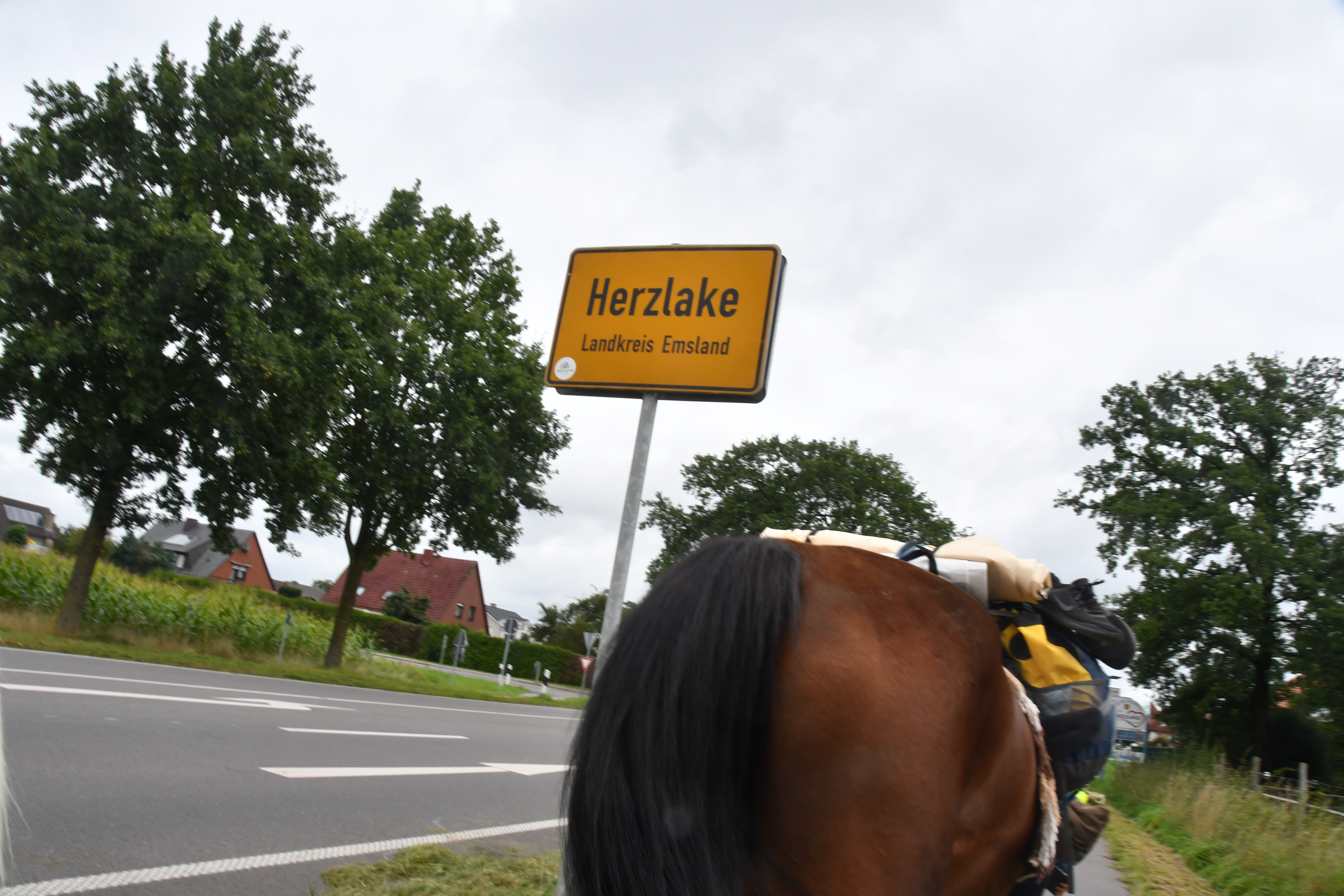Hannah nimmt ihr Schicksal an, sie sieht keine andere Wahl aber realisiert schon zu Beginn der Tagesetappe, dass es sich um einen sehr schweren Tag handeln würde. Umso wichtiger war es in dem Moment für uns nicht allzu viele Pausen zu machen sondern die Strecke bis nach Herzlake, bis zu unserem Zwischenstopp, hinter uns zu bringen. Und dies gelingt uns auch ganz gut. In Dohren machen wir eine kleine Pause, kaufen uns ein Zwiebel-, ein Käse- und ein Apfelzimtbrötchen (allesamt weiterzuempfehlen, sehr lecker!). Plötzlich hält ein Mofa-Fahrer an, steigt ab, holt zwei harte Brotscheiben hervor und tut so, als ob er diese fast zufällig dabei hätte. Dabei erklärt er, uns eben gesehen zu haben und danach hatte ihn wohl seine Neugierde so sehr gepackt, dass er uns hinterher gefahren ist bis er uns gefunden hat. Wir erklären ihm von unserer Reise, er wünscht uns viel Glück und düst, nachdem die Brotscheiben verfüttert hat, wieder davon.