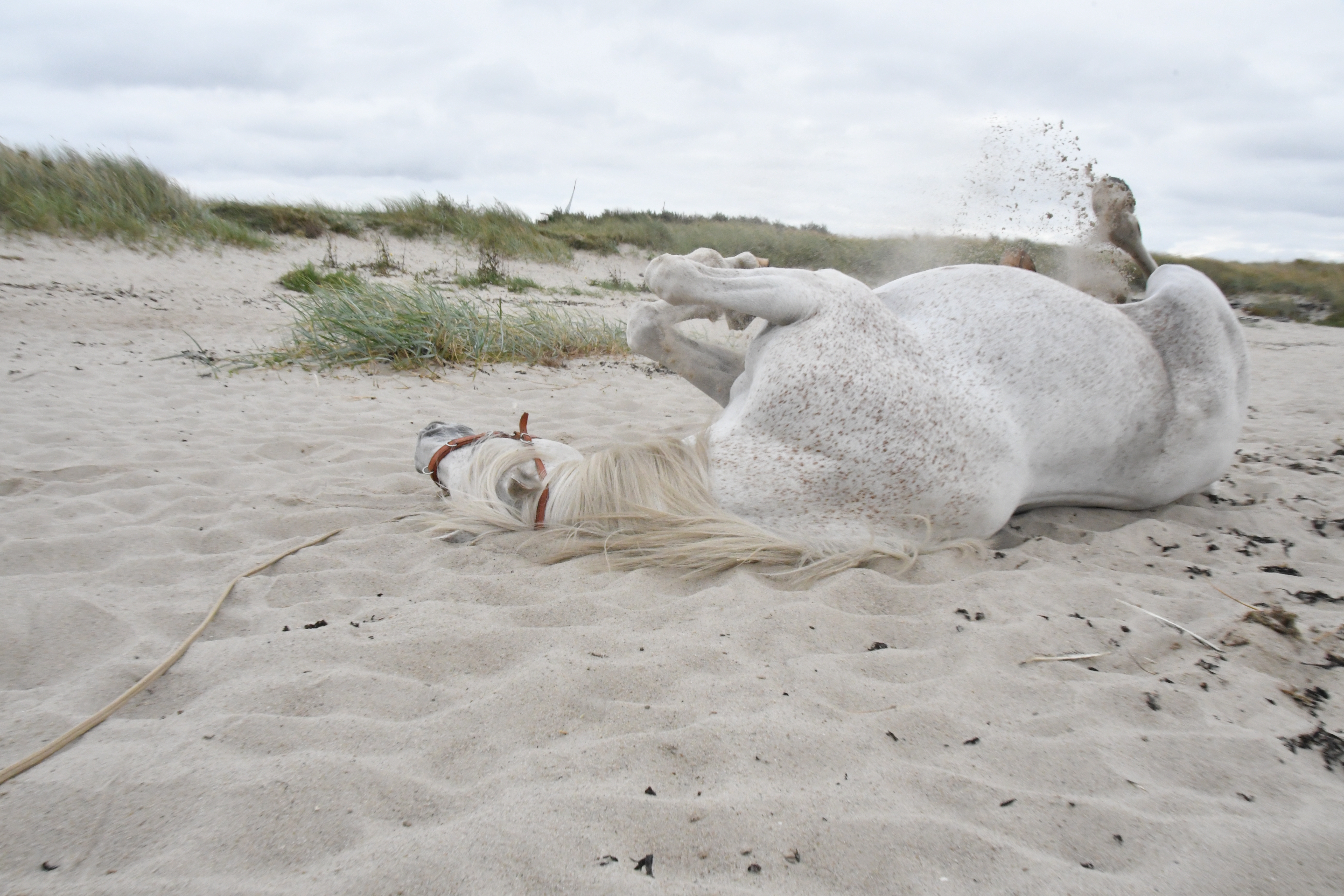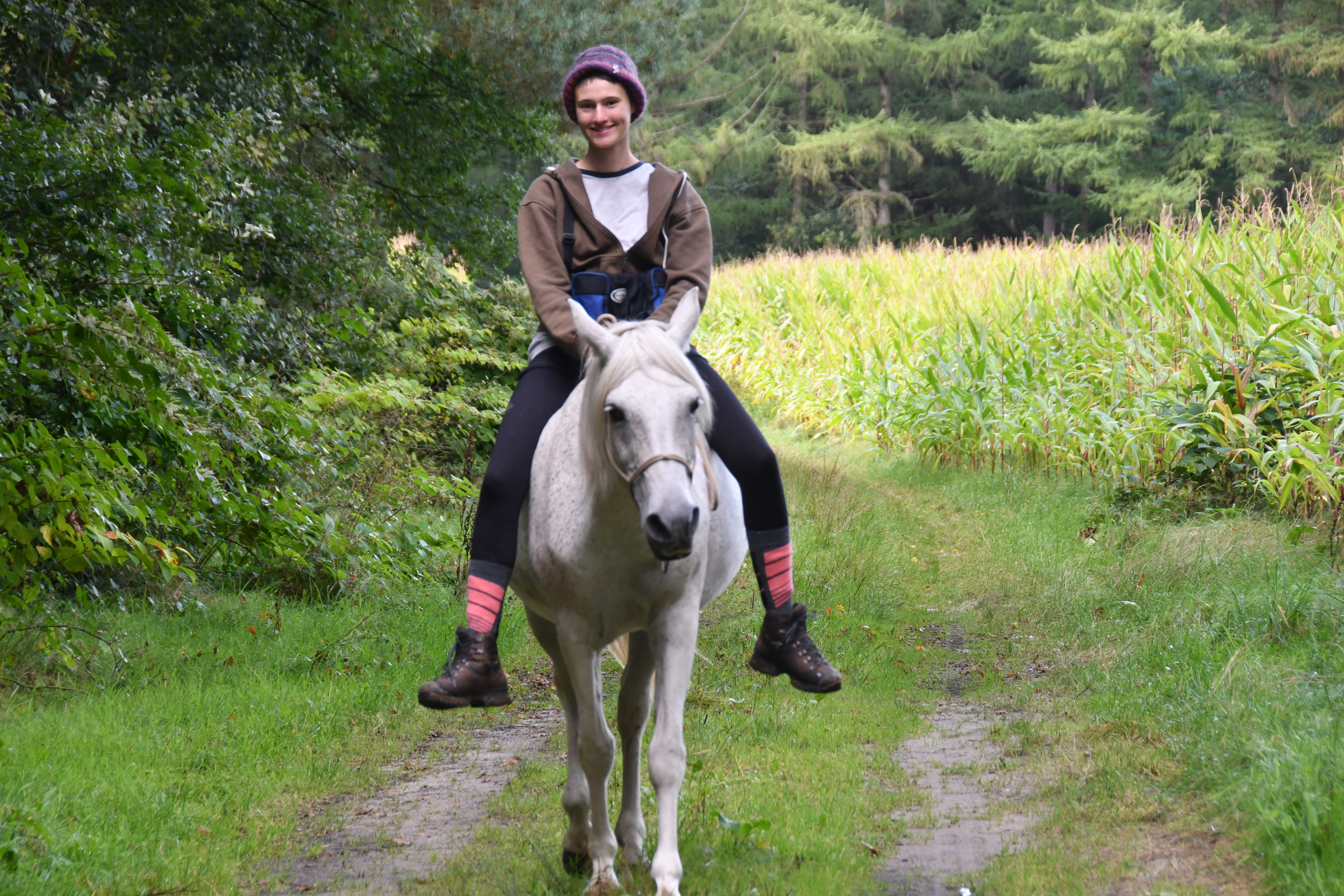 Dass Phoebe erst angeritten ist und noch keine Kommandos von oben kennt, macht den „Ritt“ umso lustiger. Immer wieder hält sie an, frisst etwas und trabt dann kurzerhand wieder auf. Manchmal überholt sie auch Amica, man merkt, dass auch die beiden Damen Spaß haben. Zu diesem Zeitpunkt haben wir die Schmerzen von vor ein paar Stunden fast wieder vergessen.