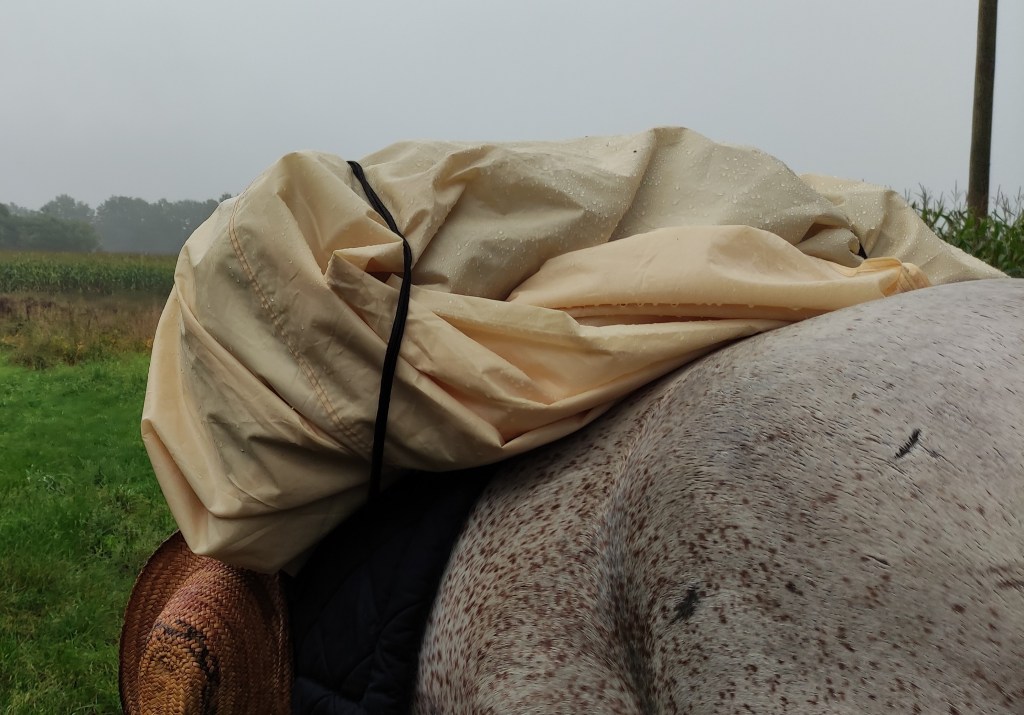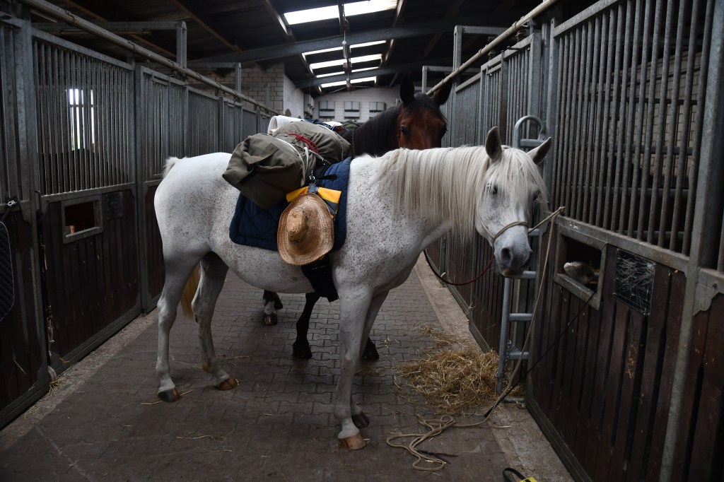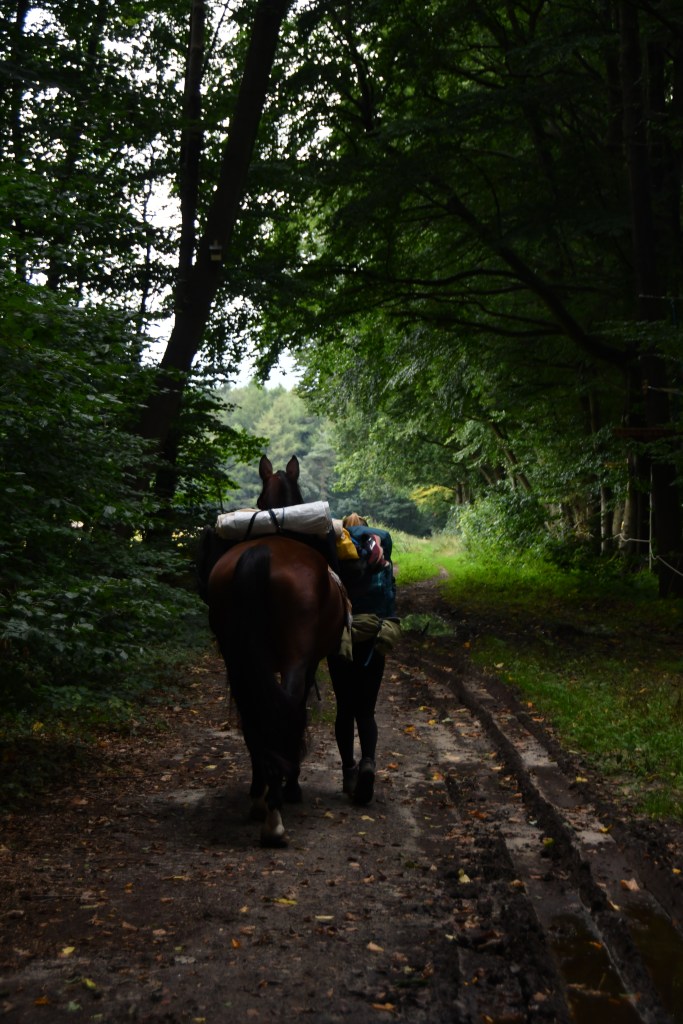 Hannah darf ausnahmsweise „ausschlafen“ und Elisa geht nach dem Aufwachen zu den Pferden um nach dem Rechten zu sehen. Als sie dort ankommt, juckt sich Phoebe schon fleißig ihr Hinterteil an einer zwecks dafür installierten Bürste. Amica frisst Heu, beiden scheint es bestens zu gehen. Danach läuft Elisa zurück und hilft den Frühstückstisch zu decken. Es folgt ein ausgiebiges Frühstück mit Brötchen und allem was dazu gehört. Wir sprechen mit A. über Hannahs gesundheitlichen Probleme, sie erzählt von einer Physiotherapeutin, die sie kennt aber nur in Notfällen kontaktieren würde, da sie ein Stück entfernt wohnt. Hannah lehnt ab, so schlimm ist es zu diesem Zeitpunkt noch nicht. Anschließend packen wir unsere Sachen zusammen, unter anderem unsere frisch gewaschene Kleidung und gekochte Eier für unterwegs, und fahren alles zum Stall. Als Hannah Phoebe raus holt und sie in die Stallgasse führt, um sie dort im Trockenen fertig zu machen, ist sie ungewöhnlich unruhig. Amica hingegen ist die Ruhe selbst. Phoebe pinkelt schließlich mitten auf die Stallgasse, hinterlässt also zu unserem Leid noch einen großen See bevor wir los kommen. Es kommen zum ersten (und letzten Mal) die Planen zum Einsatz, die als Regenschutz um das Gepäck gewickelt werden. Dann geht es endlich los, wir haben etwa 11 Uhr.