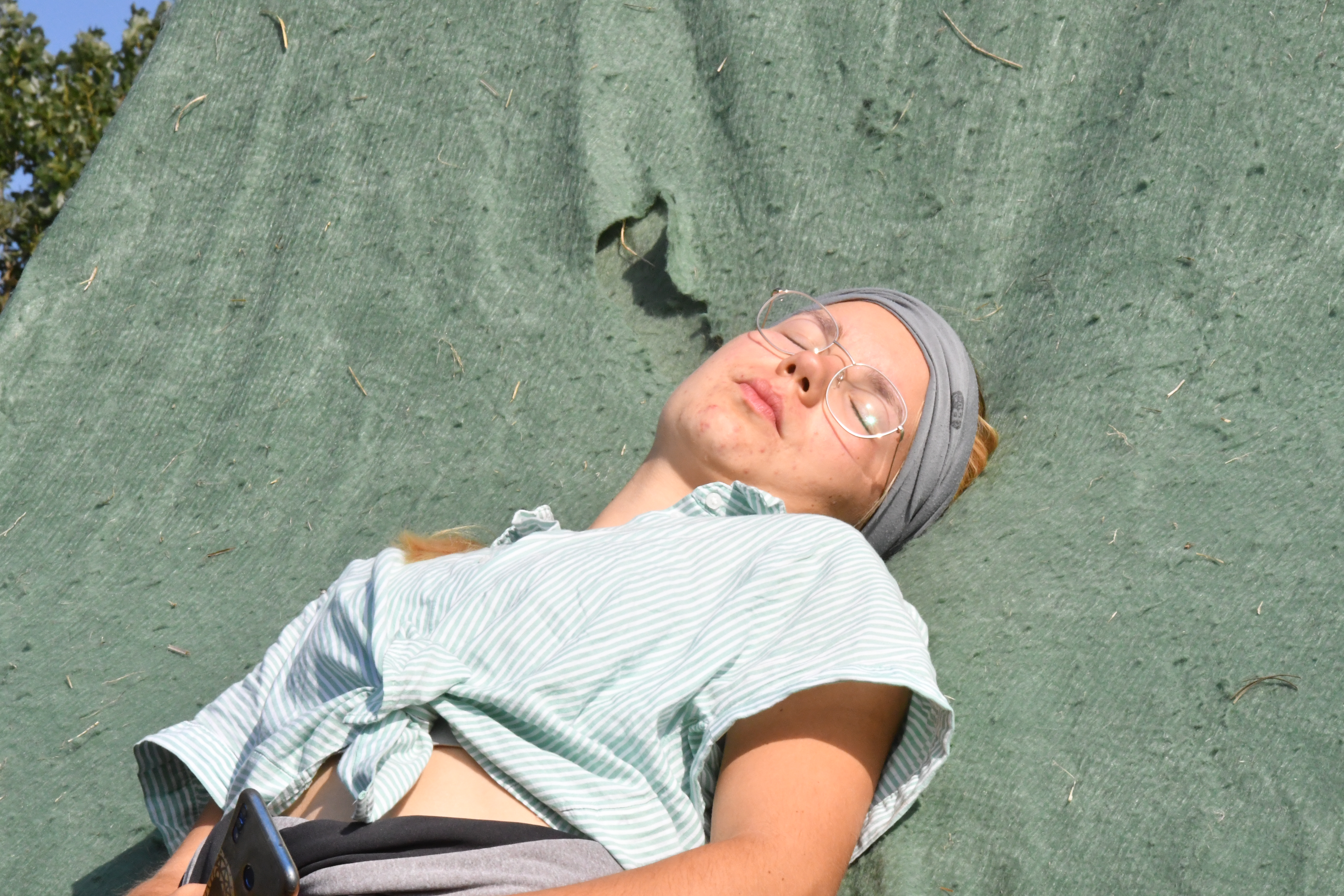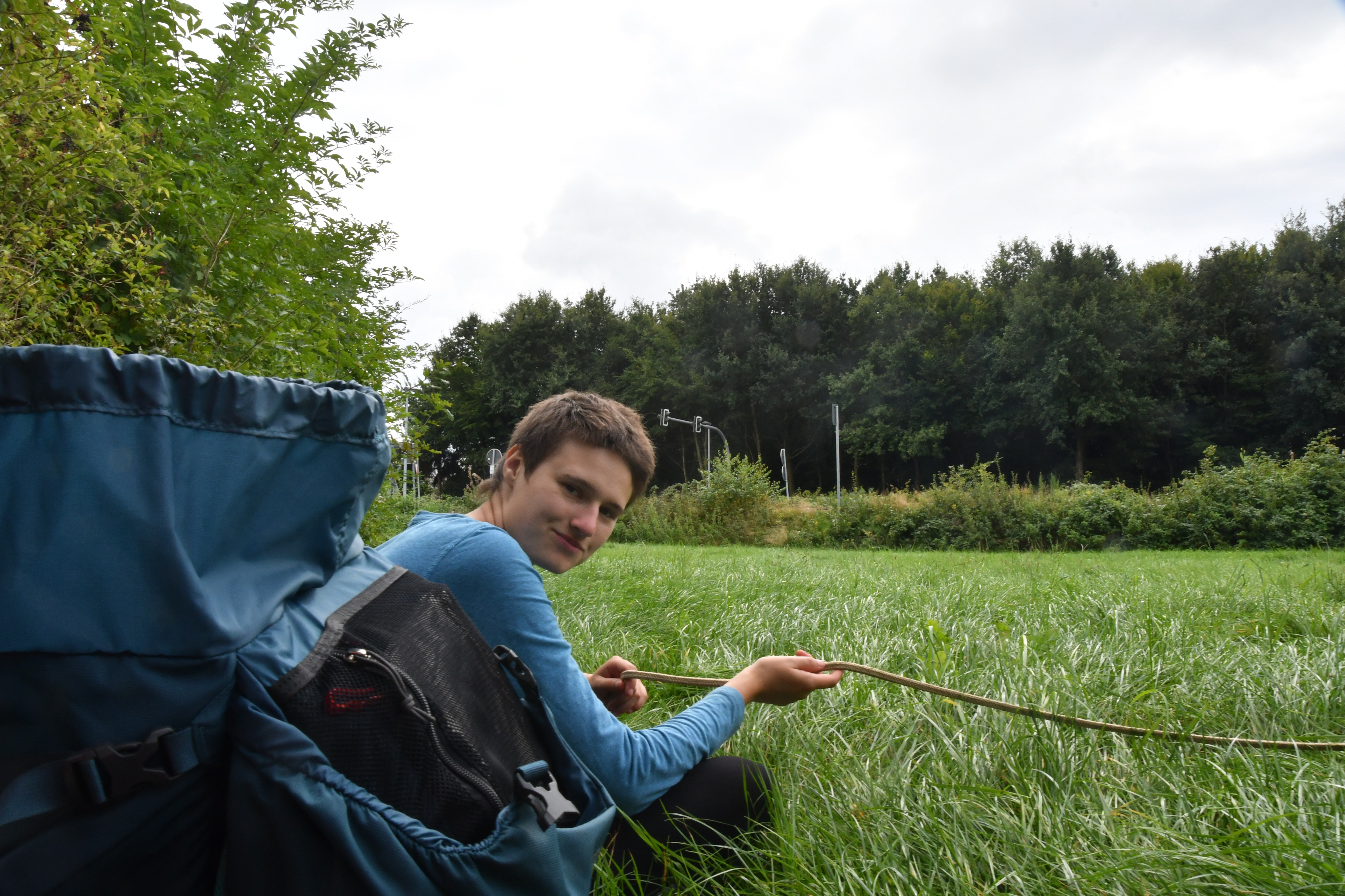 Elisa telefoniert mit ihrer Mutter, legt gerade auf, da schießt auch schon Phoebe an Hannah vorbei, wie aus dem Nichts. Der Strick wird durch Hannahs Hand gezogen und verbrennt ihren Finger. Wir brauchen mehrere Momente um zu verstehen, was der Grund für die Panik ist: Die Gepäcktasche ist verrutscht und baumelt Phoebe nun zwischen den Beinen. Anders als bei Amica handelt es sich hier um eine ganz neue Konstruktion, die zuvor kaum getestet wurde. Phoebe wird von ihrer Last befreit, wir machen vorerst eine Pause. Hannah geht ins Gebüsch zum Pinkeln, nutzt den Moment und setzt sich kurz hin. Dabei unterschätzt sie die Schweißansammlung an ihrem Hinterteil, zieht die Hose hoch und bereut im selben Moment jene Entscheidung. Nach dem Erdpeeling muss die Hose ausgezogen und gereinigt werden. Elisa lässt sich die Gelegenheit nicht entgehen und nimmt folgendes Foto auf: