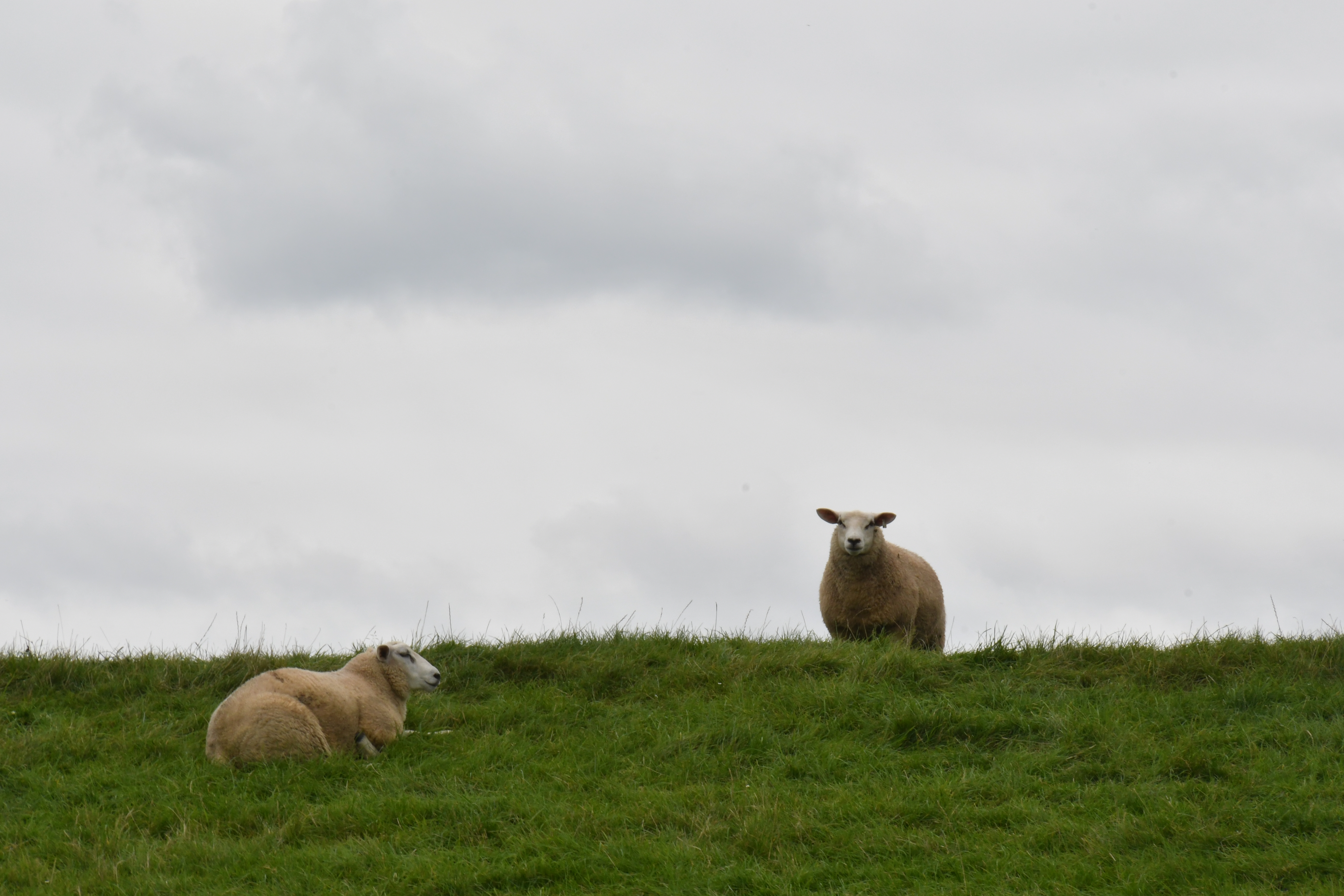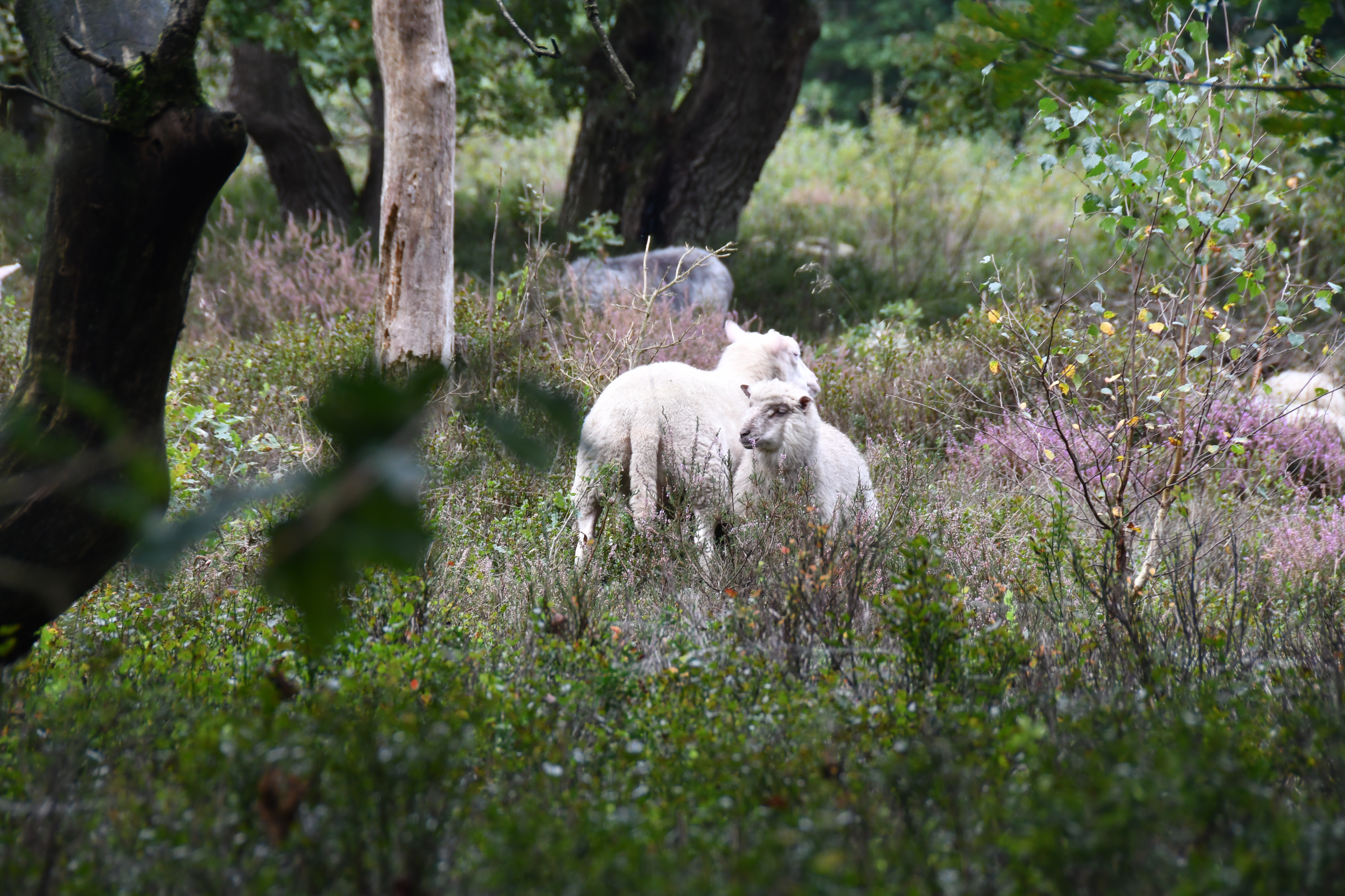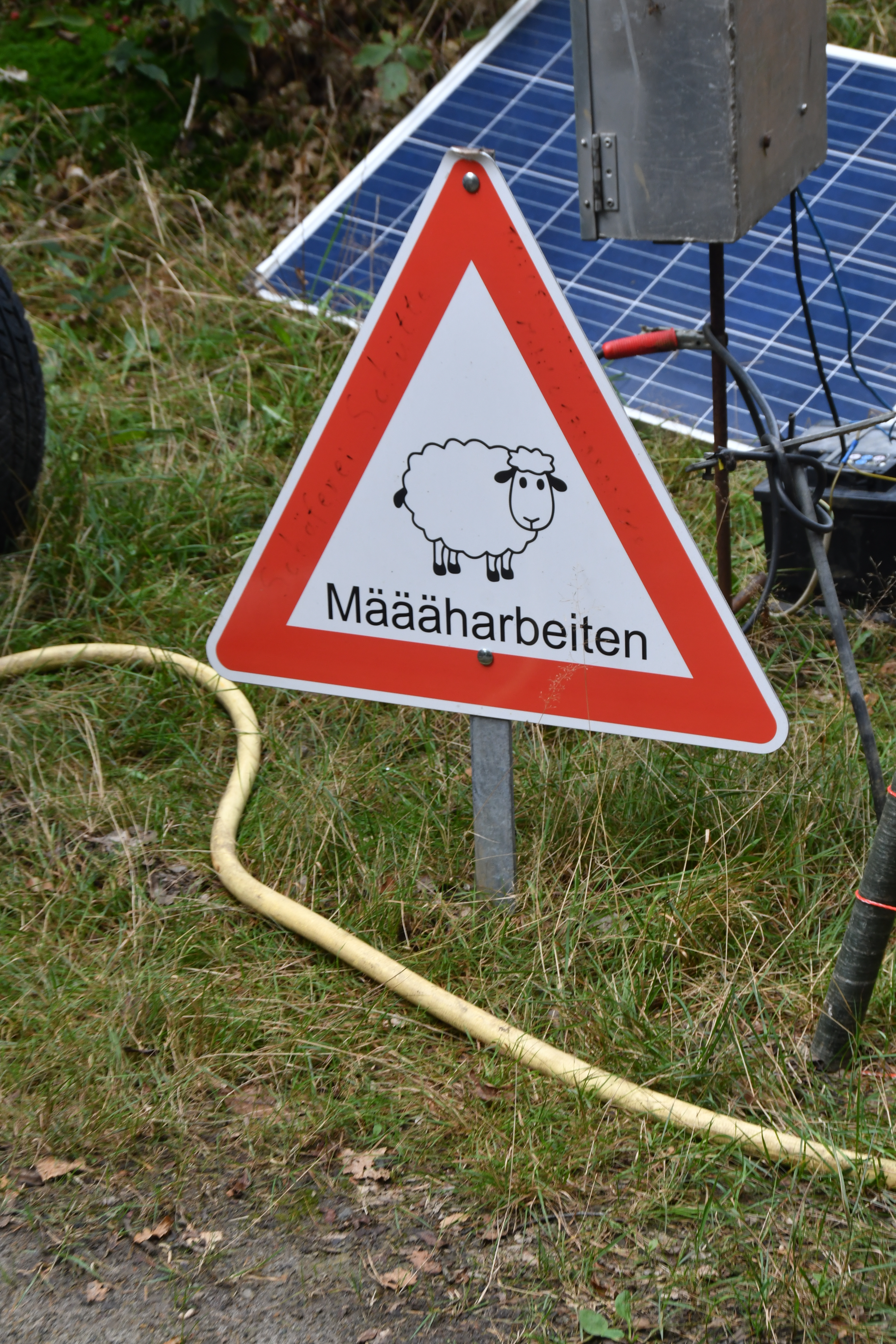 Wir kommen an einer abgezäunten Heide vorbei, wo Schafe mit einem Schutzherdenhund „Määhharbeiten“ durchführen. Wir setzen uns an einen kleinen Picknicktisch. Die beiden Pferde fressen zunächst ein bisschen am Wegrand bevor sie in einen tieferen Schlaf verfallen. Wir freuen uns über ihre Entspannung, schließlich drückt dies auch ihr Vertrauen aus – oder ihre Erschöpfung. Elisa geht in die Büsche um sich zu erleichtern, danach tauschen wir. Statt sich aber die Mühe zu machen ins Unterholz zu klettern, hockt Hannah sich einfach an den Wegrand. Just in dem Moment fährt ein Fahrradfahrer an uns vorbei. Die erste Person seit Stunden und dann in der unpassendsten Situation! Man sieht ihm an, wie er zögert, eigentlich anhalten möchte, dann Hannah erblickt und sich entschließt weiter zu fahren..
