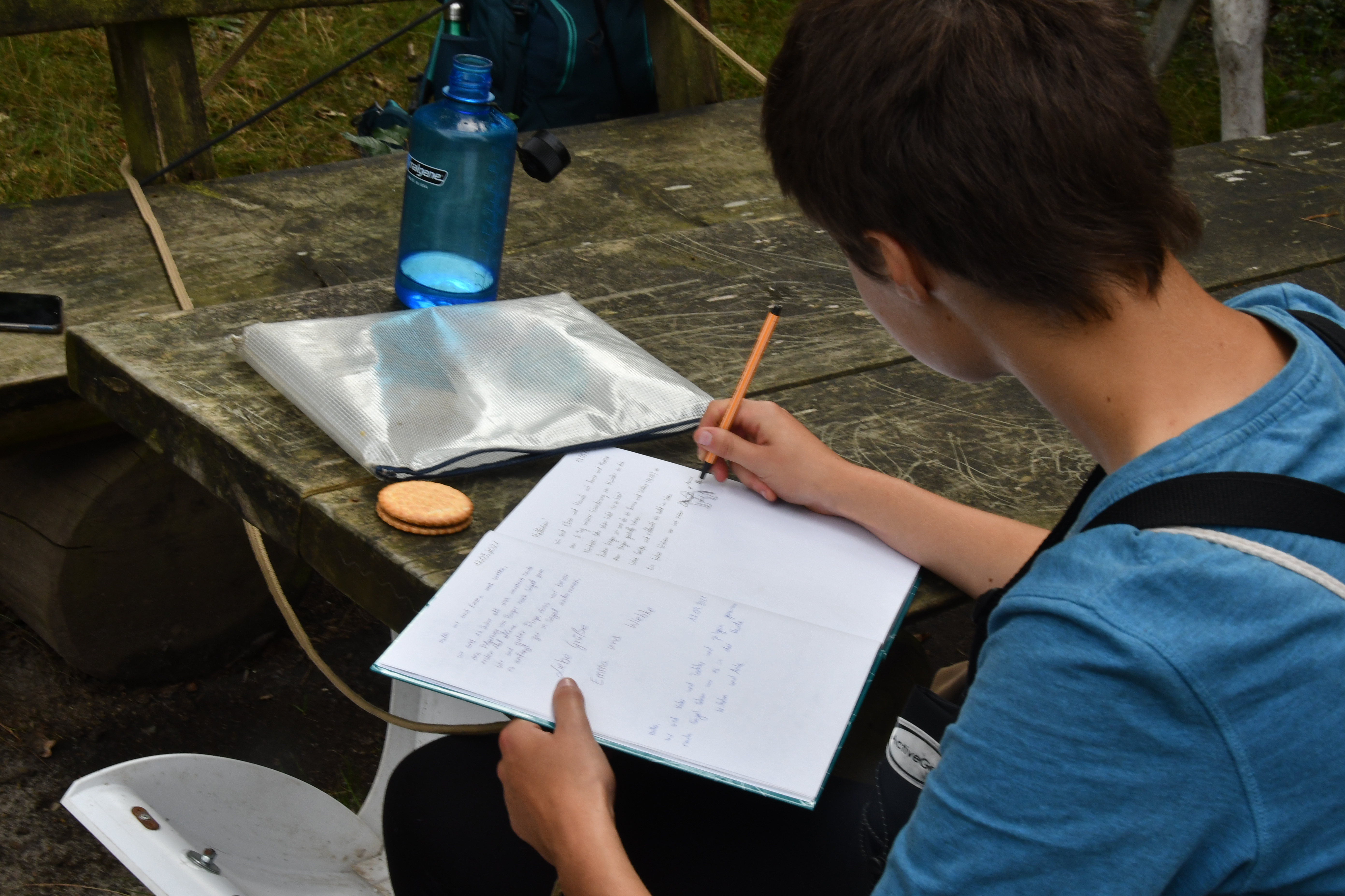 Wir setzen uns an den Tisch, packen unser Proviant aus. Insbesondere Doppelkekse stehen seit Beginn der Wanderung ganz hoch im Kurs. Hannah entdeckt ein Gästebuch, das am Tisch befestigt ist. Sie hinterlässt einen Gruß inklusive kleiner Zeichnung von uns vieren. Währenddessen steckt Elisa Kekskrümel in die hängende Unterlippe von Amica.