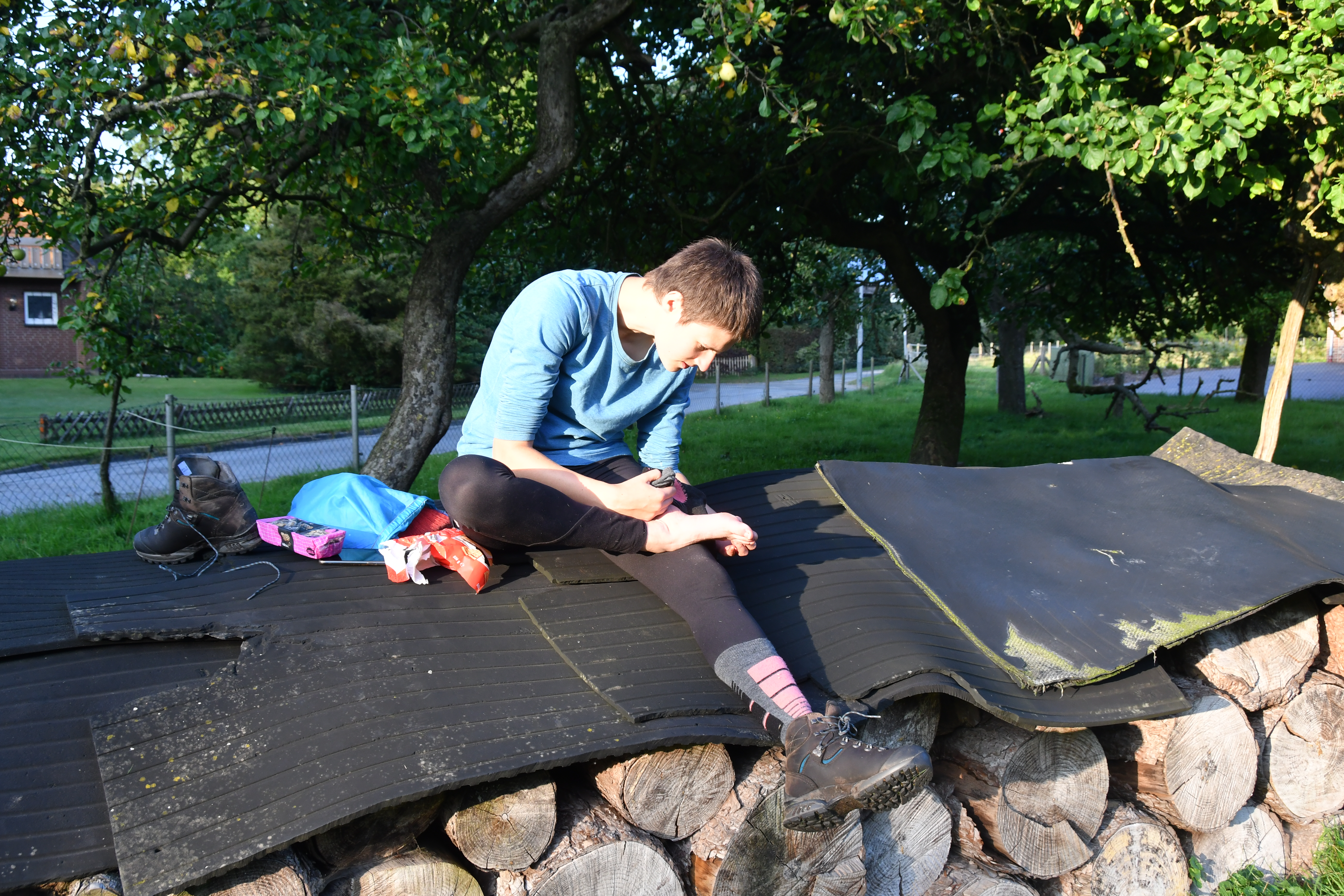 Wir werden gefragt wo wir schlafen. Hannah deutet auf die Wiese und erklärt, dass wir zwar kein Zelt aber Planen, Decken, Isomatte und Schlafsack dabei haben. Die Frau, C., sieht bestürzt aus und denkt nach. Wir sehen, wie sich die Familie berät und uns schließlich in den Partyraum einlädt. Wir freuen uns sehr über das Upgrade: haben nun ein Dach über den Kopf und sogar eine Toilette. Wir räumen unsere Sachen hinein und setzen uns wieder zu den Pferden. Hannah untersucht ihre Blasen, Elisa führt die täglichen Dehnübungen mit Amica durch als schließlich C. erneut heraus kommt und uns zu einem Kaffee am nächsten Morgen einlädt.