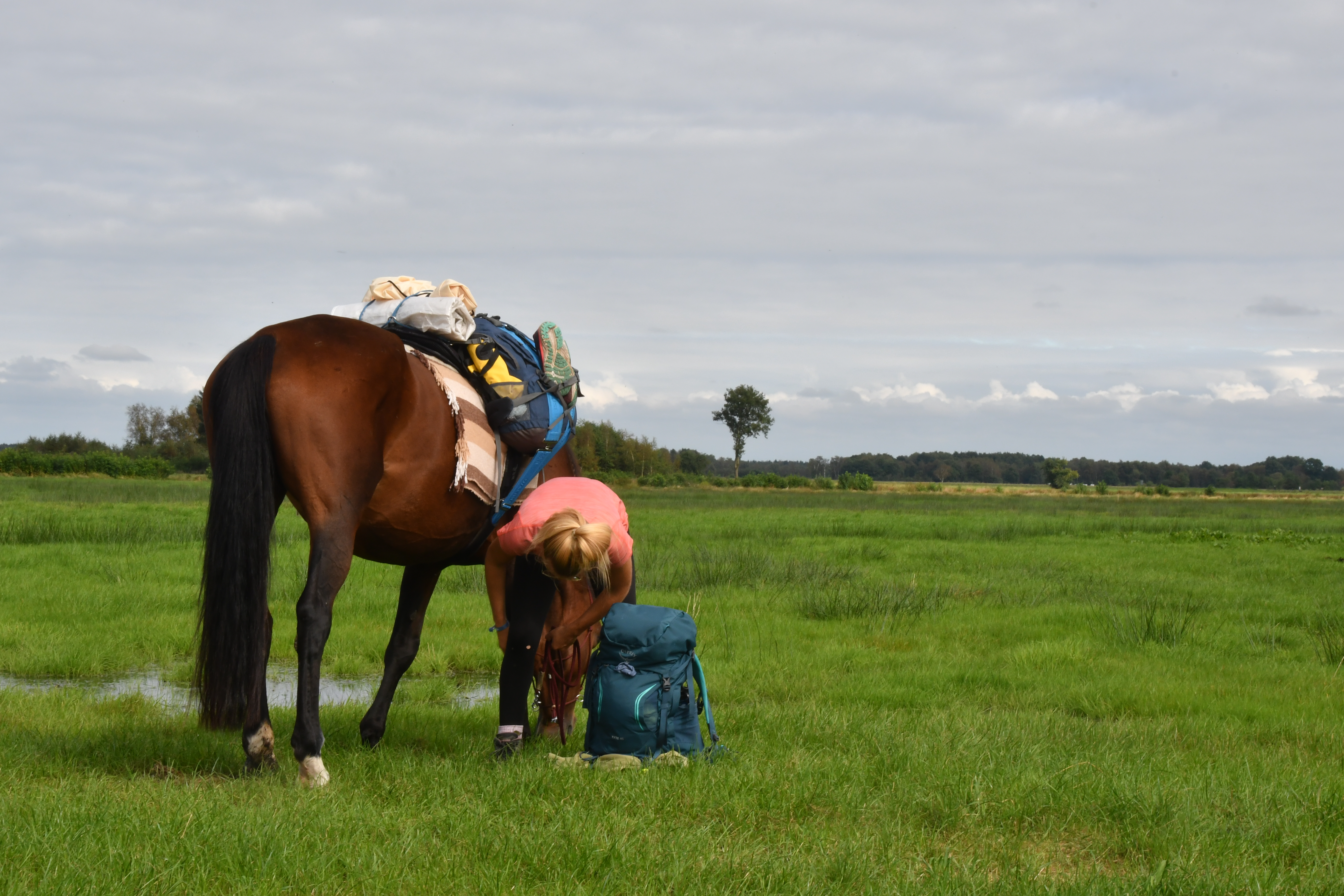 Wir stehen früh, um 6 Uhr, auf, um den verbleibenden Aufenthalt so kurz wie möglich zu halten. Da wir mit dem Woilachs geschlafen haben, muss die Packtasche von Phoebe wieder komplett neu gepackt werden. Die Woilachs liegen nämlich in der Tasche so, dass sie zu Phoebes Satteldecke zeigen und diese vom restlichen Prüll trennt, um so die Druckfläche auf Phoebes Rücken so regelmäßig wie möglich zu halten. Auch wird etwa mittig ein rotes Seil gezogen, sodass die Wirbelsäule sich möglichst frei bewegen kann. Dafür muss die Tasche vom Gewicht her in zwei Hälften geteilt werden. Gar nicht so einfach, wenn man darin noch nicht so viel Übung hat. Elisa putzt die Pferde drüber. Als Hannah schließlich mit dem Packen fertig ist, geht sie zu Phoebe in die Box und will ihr den Longiergurt anlegen, an den am Ende die große Packtasche sowie auf jeder Seite jeweils ein wasserdichter Segelsack befestigt werden. Dabei fällt ihr jedoch eine starke Schwellung am Bauch auf. Darüber hinaus scheint Phoebe Schmerzen zu haben, sie zieht bei jeglicher Berührung an der Schwellung den Bauch sichtbar ein. Da sie dieselbe Reaktion auch an einer Stelle am Genick zeigt, die Hannah am Vorabend ebenfalls eingecremt hat, ist schnell klar, dass es sich hier um eine allergische Reaktion auf den Wirkstoff in der Creme handeln muss. Ärgerlich aber nichts dran zu ändern: Phoebe kann nicht nachgegurtet werden und somit auch kein Gewicht tragen. Es bleibt keine andere Wahl als dass Hannah alles in die große Tasche packt und diese selbst trägt. Das Gepäck mit der restlichen Ausrüstung, unter anderem auch die Kamera, bringen ein geschätztes Gewicht von immerhin 15 kg auf die Waage.