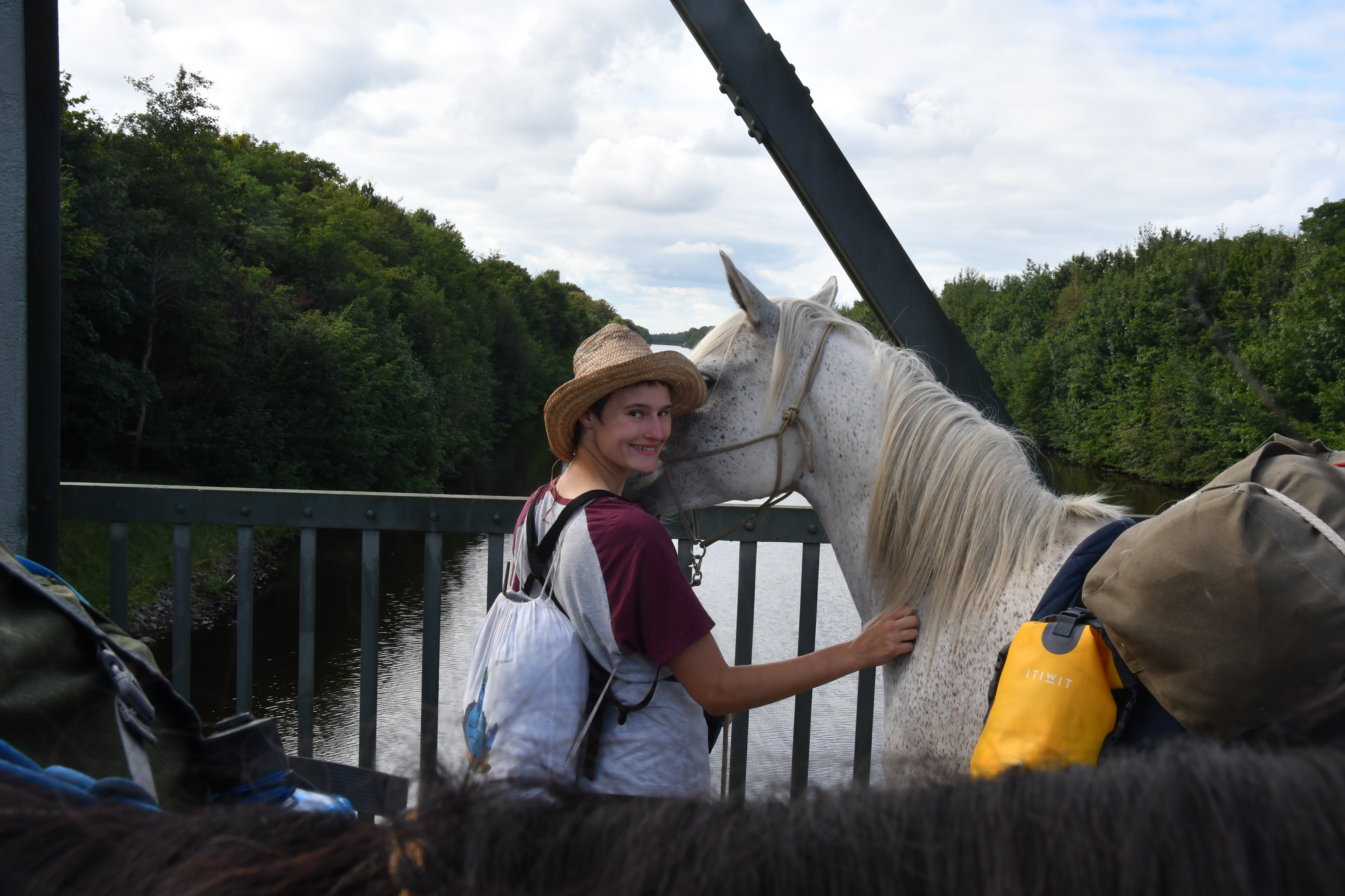 Wir fühlen uns wie im Nirgendwo, in der Ferne sieht man Häuser aber weit und breit keine Menschen. Wir lösen Phoebes Strick. Der Weg ist zwar landschaftlich schön aber da es keinerlei Abwechslung gibt, auch dementsprechend sehr schlicht. Sowohl Hannah als auch die Pferde sind sehr gut drauf. Elisa hingegen hat starke Fußschmerzen, unter anderem wegen der Blasen. Für sie ist dieser Tag der schmerzintensivste. Wir machen zwischendurch eine Pause, es gibt Eier, Knäckebrot und Müsliriegel. Wir kommen an einer Schnellstraße aus, parallel fließt ein Kanal. Phoebe wird wieder angebunden. Wir tränken die Pferde und überqueren kurze Zeit später eine Brücke. Hier müssen wir leider auf Schritttempo abbremsen.. 😀