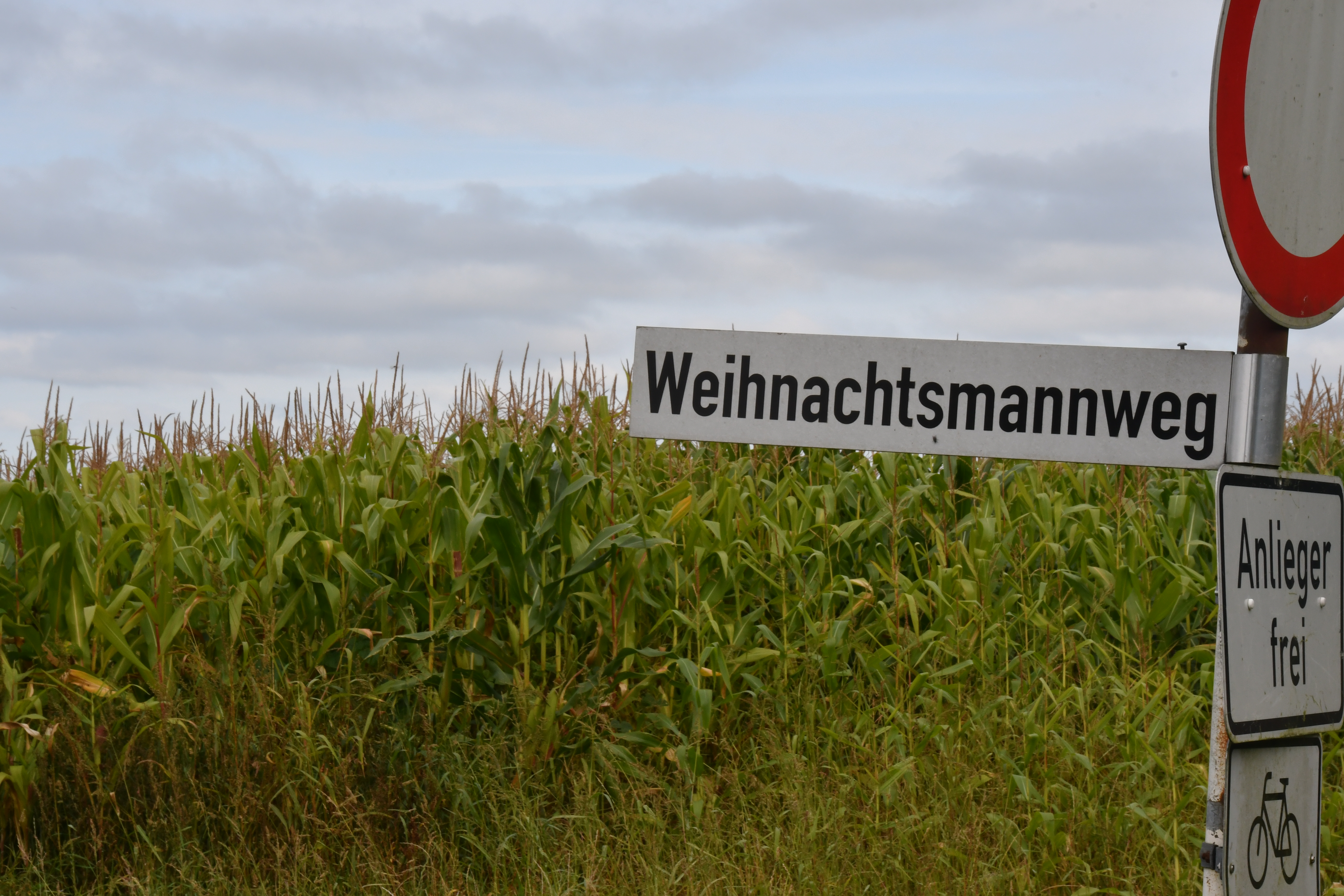 Nach den ersten paar hundert Metern machen wir noch im Dorf auf einer Wiese Halt um zu frühstücken. Dabei werden die Donuts probiert und für perfekt empfunden. Wir gehen weiter, kommen irgendwann auf einen schön gepflasterten Weg und schließlich auf den „Weihnachtsmannweg“. Leider zu der falschen Jahreszeit..