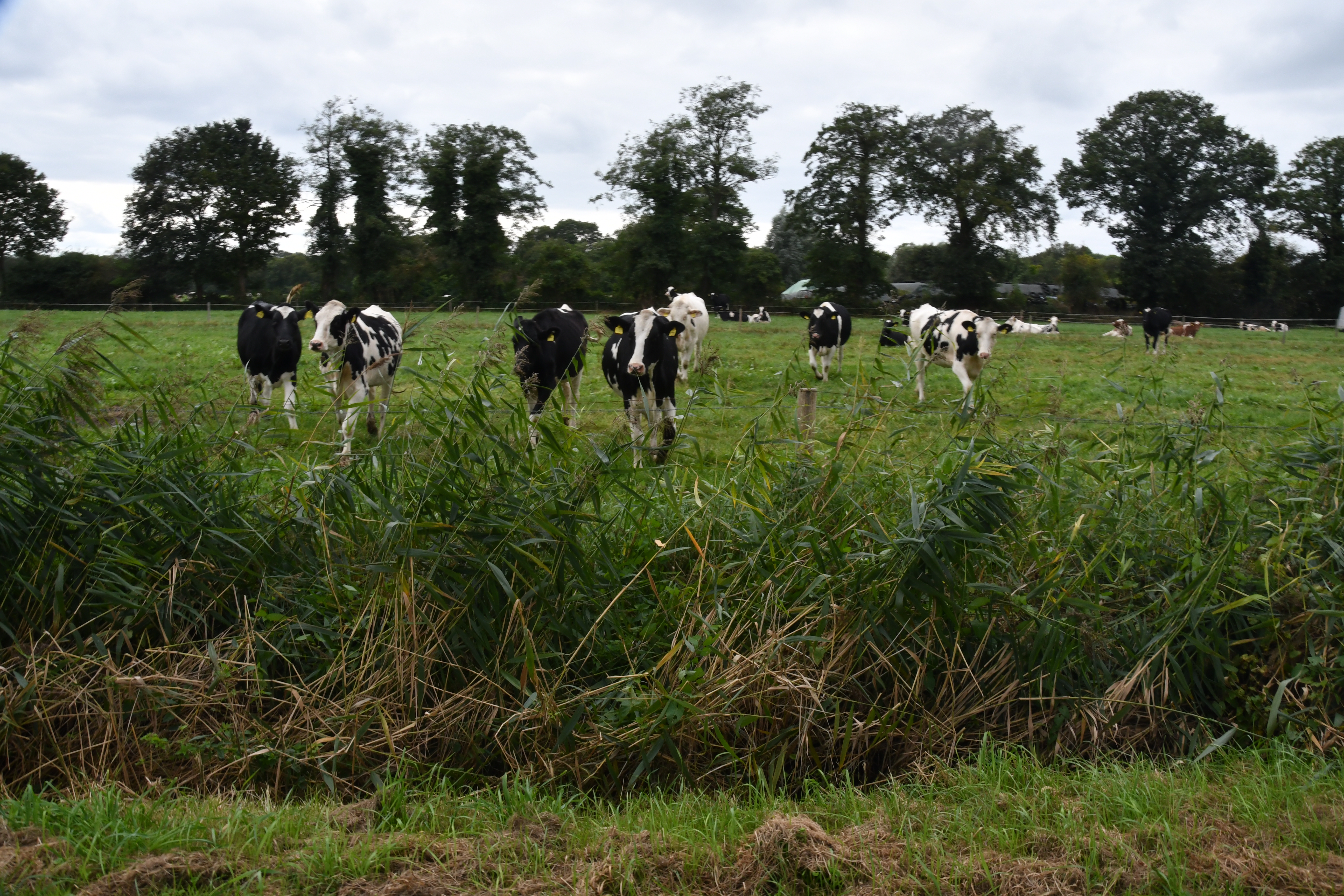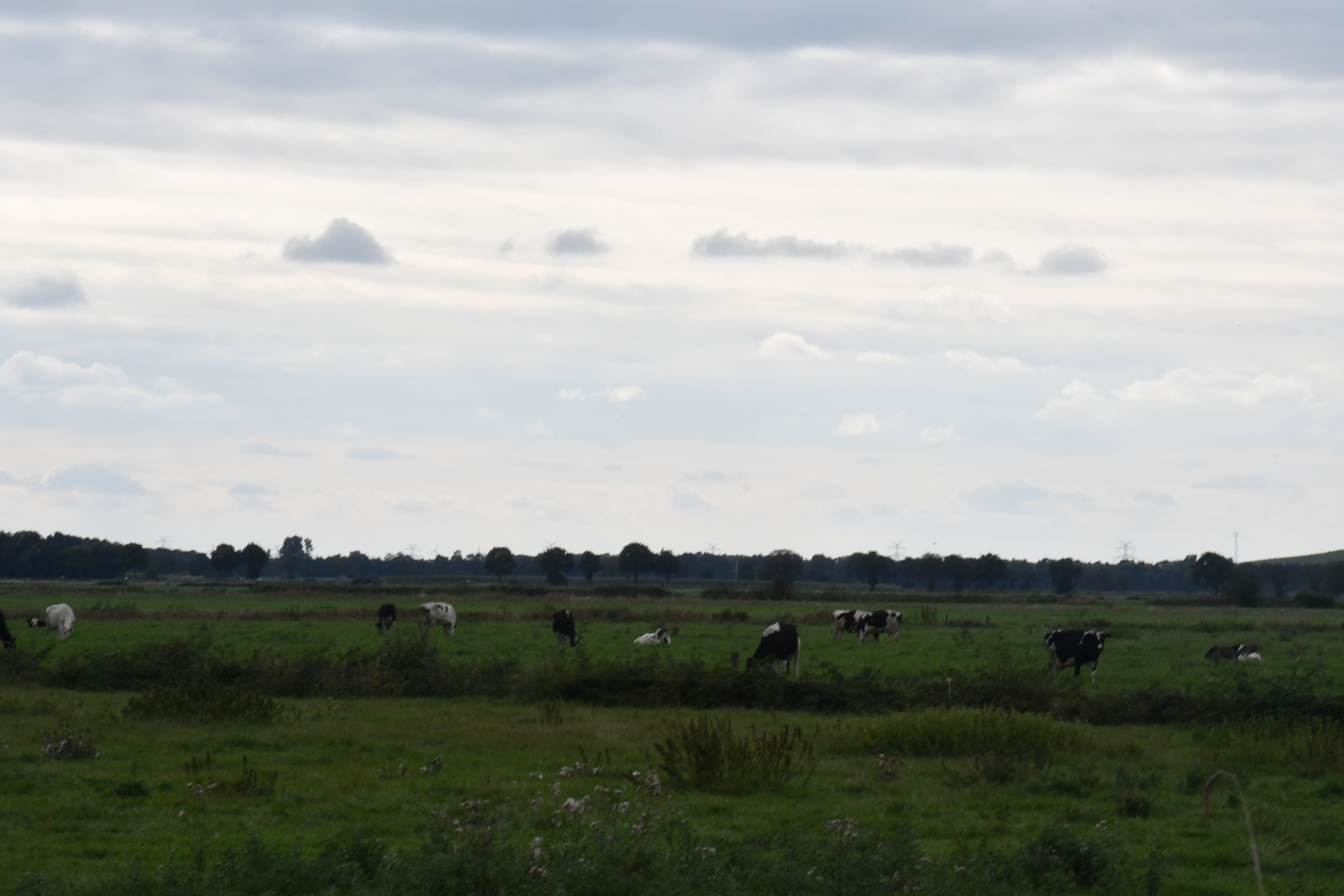 Nach der Brücke machen wir eine Pause. Die Pferde haben sich eine ausgiebige Graspause verdient und auch wir müssen erstmal zur Ruhe kommen. Es hält eine Frau mit ihrem Auto neben uns und fragt, ob sie uns helfen kann, sie kann uns und unseren Pferden auch gerne eine Unterkunft anbieten. Wir freuen uns aber lehnen dankend ab, denn wir wollen es heute noch bis nach Rysum schaffen. Die Frau fährt weiter. Wir reden gerade über den Mann und wie unwohl wir uns beide gefühlt haben, da entdeckt Hannah ihn erneut. Sie steht mit dem Blick auf die Brücke und sieht klar und deutlich, wie er auf der anderen Straßenseite die Brücke hinab fährt, unverwechselbar sehr bunt gekleidet. Wir bekommen beide Angst. Da er unser Ziel kennt, befürchten wir, dass er uns weiter verfolgt, vielleicht auch ohne dass wir es bemerken und uns später auflauert. Wir gehen sehr bedrückt weiter. Hannah läuft hinten und schaut immer wieder zurück aber sieht ihn glücklicherweise nicht mehr. Wir reden über die Situation und kommen zu dem Ergebnis, dass wir absolut nicht damit hätten rechnen können, dass sich die Lage derartig ändern würde und aus einem harmlosen Gespräch eine solche, für uns potentielle, Gefahr entstehen würde. Elisa telefoniert mit ihrer Mutter, schildert ihr die Ereignisse. Wir laufen weiter, entspannen uns langsam und anstelle der Angst tritt langsam aber sicher die Erschöpfung ein. Erschöpfung nach 10 vollen Tagen Wandern. Auch die Pferde sind erschöpft. In jeder Pause gähnen sie, Amica bleibt zwischendurch stehen und streikt, Phoebe läuft mittlerweile mit einer klaren Präferenz auf Grasboden oder Erde. Ihre Hufe hatten sich abends noch kühl angefühlt, heute morgen allerdings schon etwas warm. Auch unsere mentale Erschöpfung ist zu spüren als wir an einer Reihe von Pappeln und Eschen kommen und minutenlang „Eschescheschesche“ wiederholen und lachen. Wir können nicht mehr. Aber hier gibt es auch nichts. Nichts außer Wiesen, Maisfelder und Kuhs. Wir queren die Hauptstraße, ein schwarzer Audi hält neben uns auf einem der Feldwege. Wir reißen uns zusammen um nicht genervt auf die üblichen Fragen zu antworten. Doch die Frau gibt sich selbst als Pferdehalterin zu erkennen. Das Interesse von unserer Seite ist augenblicklich geweckt. Leider übernimmt sie gerade einen Hof und die Lage ist etwas kompliziert. Aber kurz vor ihrem Hof liegt noch ein anderer Stall, der möglicherweise Platz hat.