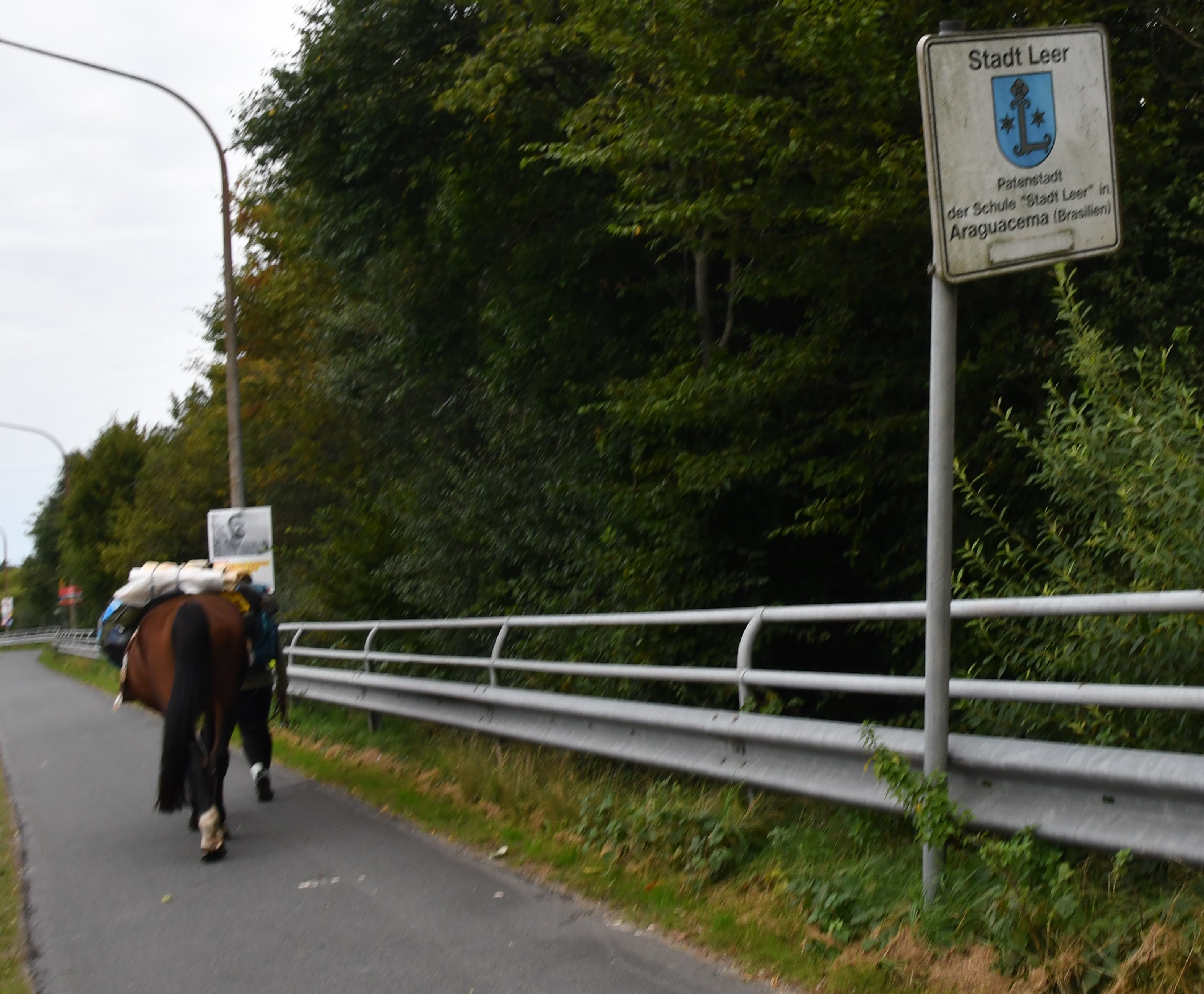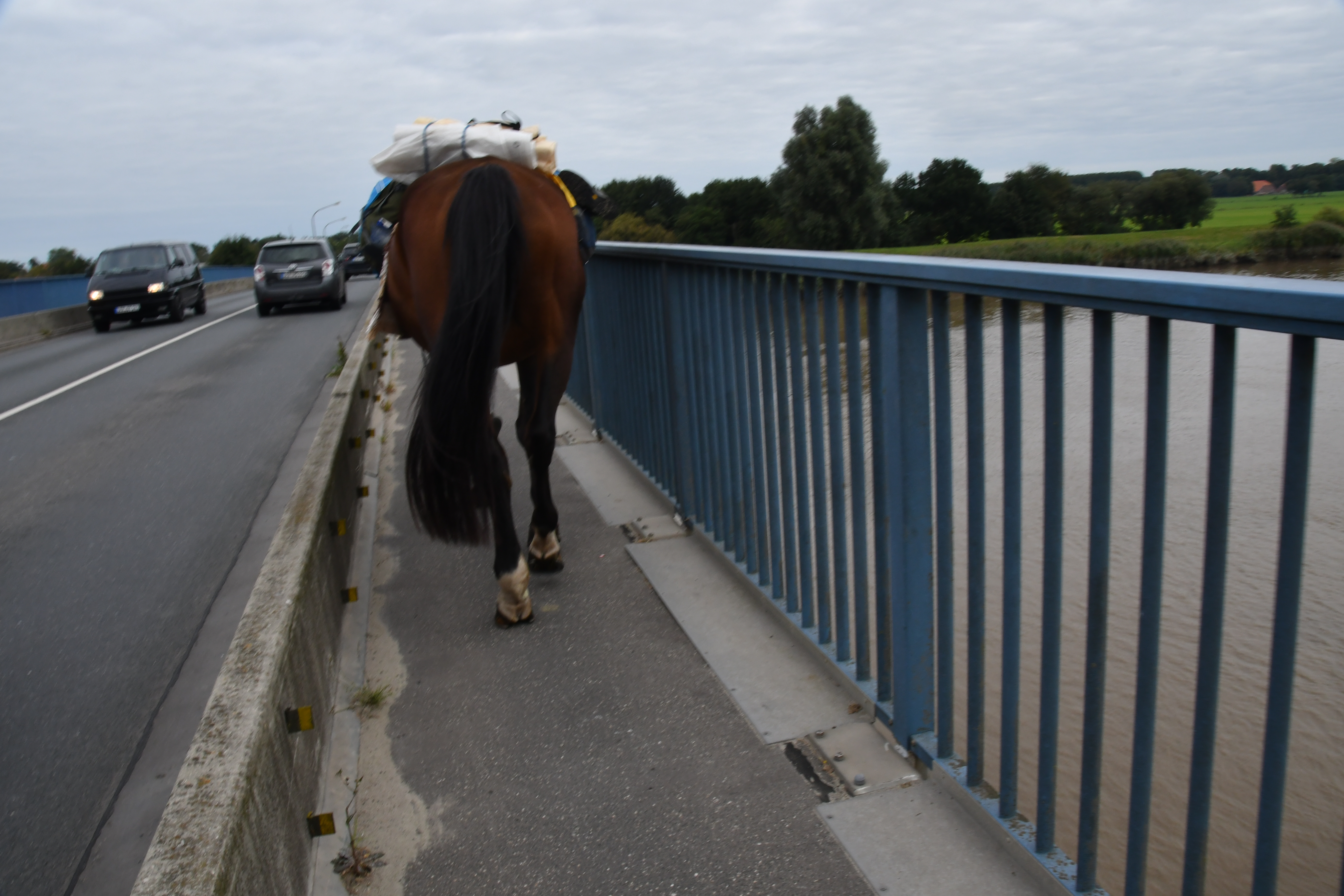 Wir müssen Deich und Ems über eine Brücke überqueren. Oben sind wir überrascht von der Größe. Zudem herrscht dichter Verkehr, die Fußgängerspur ist eng. Links von uns ist eine niedrige Mauer, die uns von den Autos und LKWs trennt, die direkt an uns vorbei fahren. Rechts wird der Weg vom Geländer begrenzt. Zu allem Überfluss kommt uns jetzt auch noch ein Fahrradfahrer entgegen. Es geht um Millimeter, insbesondere bei Amica. Aber wir schaffen es! Ein Hoch auf unsere Pferde, die in dieser etwas brenzligen Situation die Ruhe selbst sind als ob sie wüssten, dass etwaige Eskapaden in diesem Moment katastrophal sein könnten. Wir sind mächtig stolz als wir die Brücke verlassen und Leer erreichen.