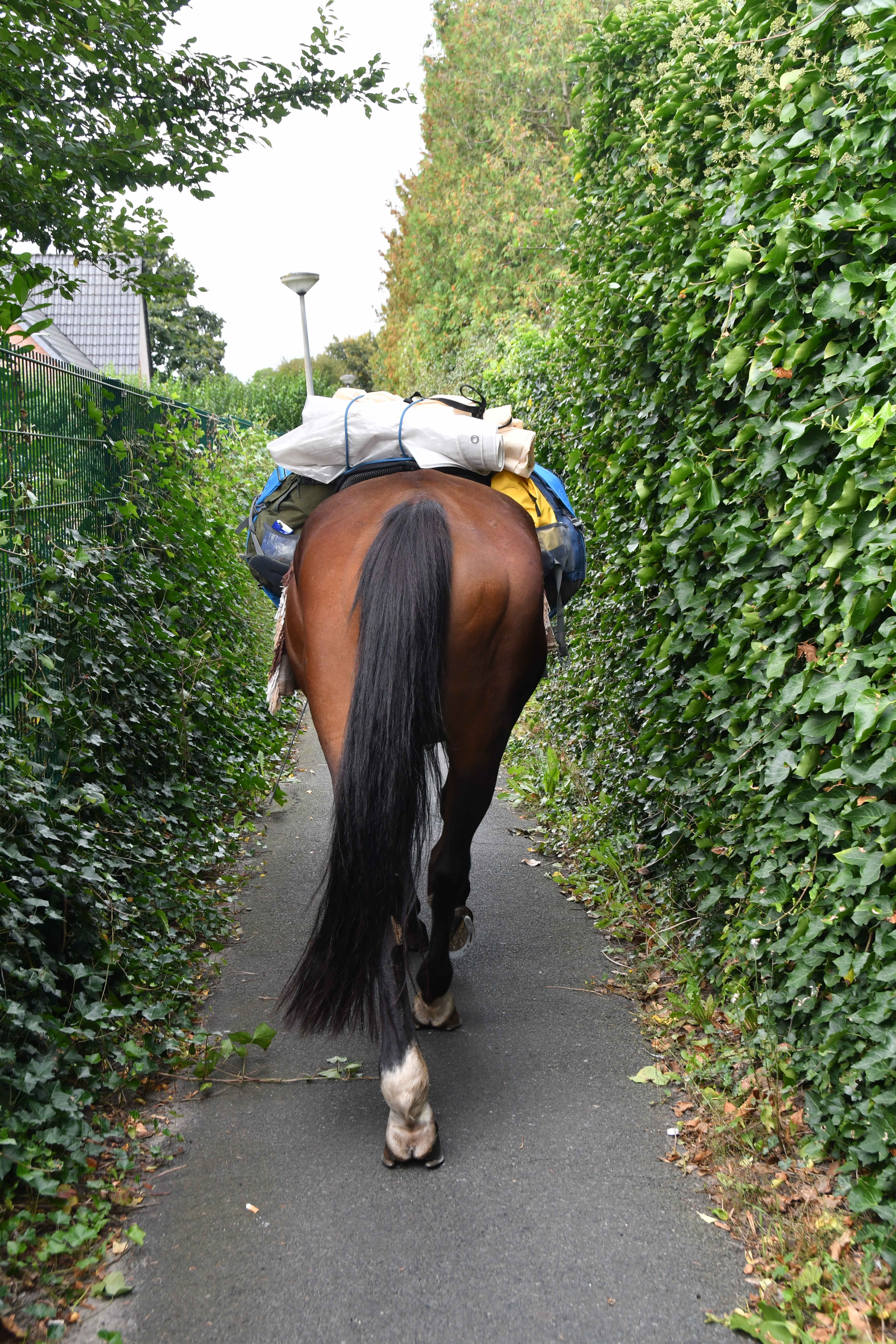 Wir gehen weiter, kommen in ein Wohngebiet. Ein Mann im Auto fährt vorbei und grinst uns breit an. Später begegnen wir ihm wieder: Er steht an der Haustür und ruft seine Frau zu sich um ihr uns zu zeigen. Uns wird eine gute Reise gewünscht. Je weiter wir in das Wohngebiet vordringen, desto größer wird die Kinderschar, die uns folgt. Zuerst ist es nur ein Junge auf seinem Fahrrad, dann immer mehr. Es stellt sich als großes Glück heraus, denn unsere Wander-App schickt uns auf einen Fußgängerweg, der zu schmal für unsere dick bepackten Pferde ist. Der Junge führt uns hilfsbereit durch den Garten eines Mehrfamilienhauses, jetzt folgen uns etwa 20 Kinder und ein Vater. Zum Dank dürfen sie unsere Pferde streicheln. Wir sind uns sicher für das ein oder andere Abendbrotgespräch gesorgt zu haben.