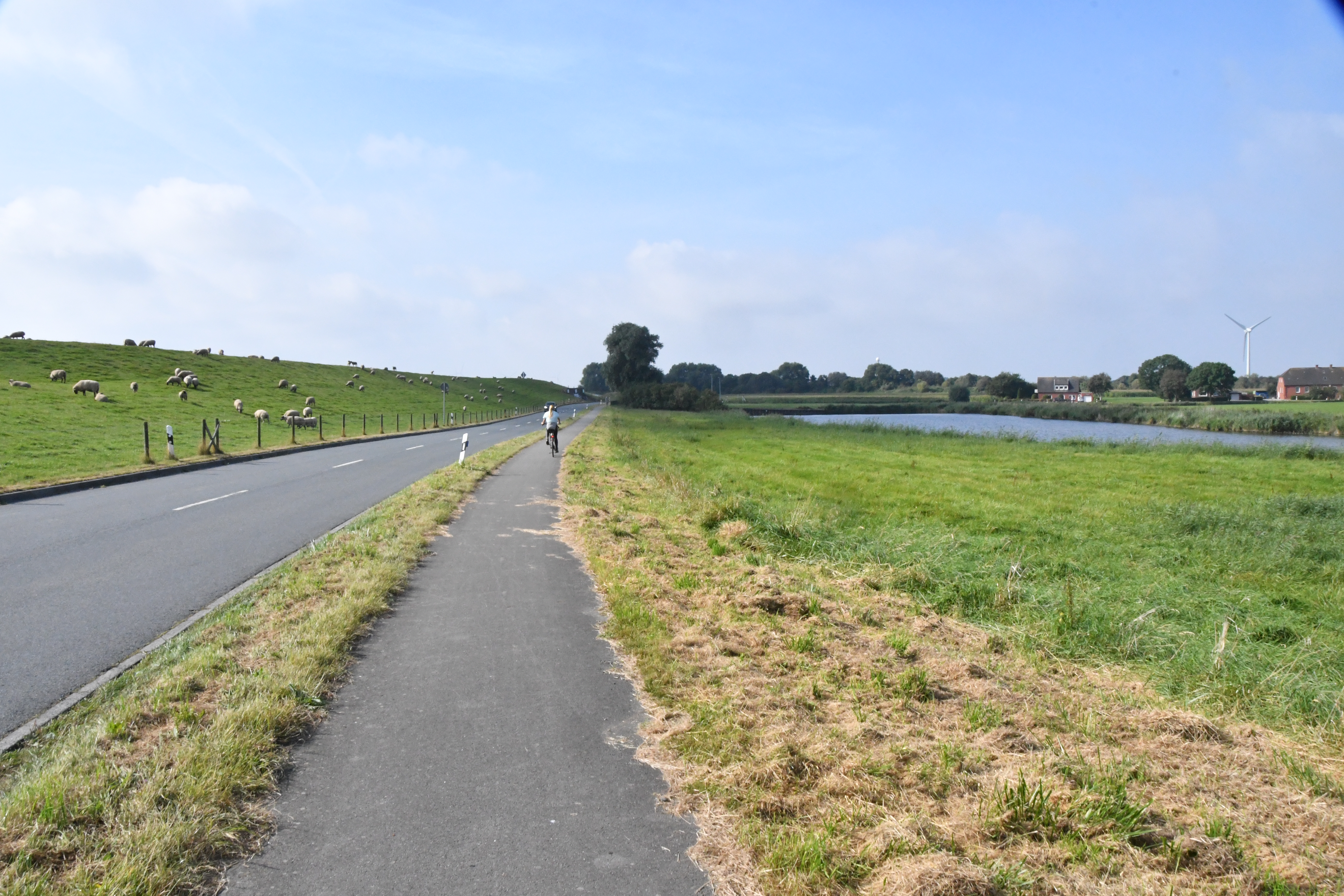 Wir biegen noch einmal ab, sehen den Deich und freuen uns schon: Laut unserer Wander-App sollen wir bald auch oben drauf laufen. Jedoch stellt sich leider heraus, dass dies in Begleitung der Pferde nicht möglich ist, da überall Schafszäune stehen. Stattdessen geht es die ganze Zeit geradeaus parallel an der Straße entlang. Beim nächsten Hof machen wir Halt um nach Wasser für die Pferde zu fragen. Tatsächlich handelt es sich um einen Reitstall und eine Einstallerin ist besonders nett und klärt uns auf: Es gibt kaum eine Ecke an der Nordsee an der man Reiten kann. Es gibt überhaupt kaum Strand. Im Norden gibt es durch die Saison noch mehr Einschränkungen. Sie empfiehlt uns die „Knock“. Ein Stück Sandstrand bei Rysum. Wir sind froh endlich einen Namen als Ziel zu haben und laufen gestärkt weiter. Den Großteil des Tages geht es nur noch auf diesem Fahrradweg entlang. Es zieht sich.