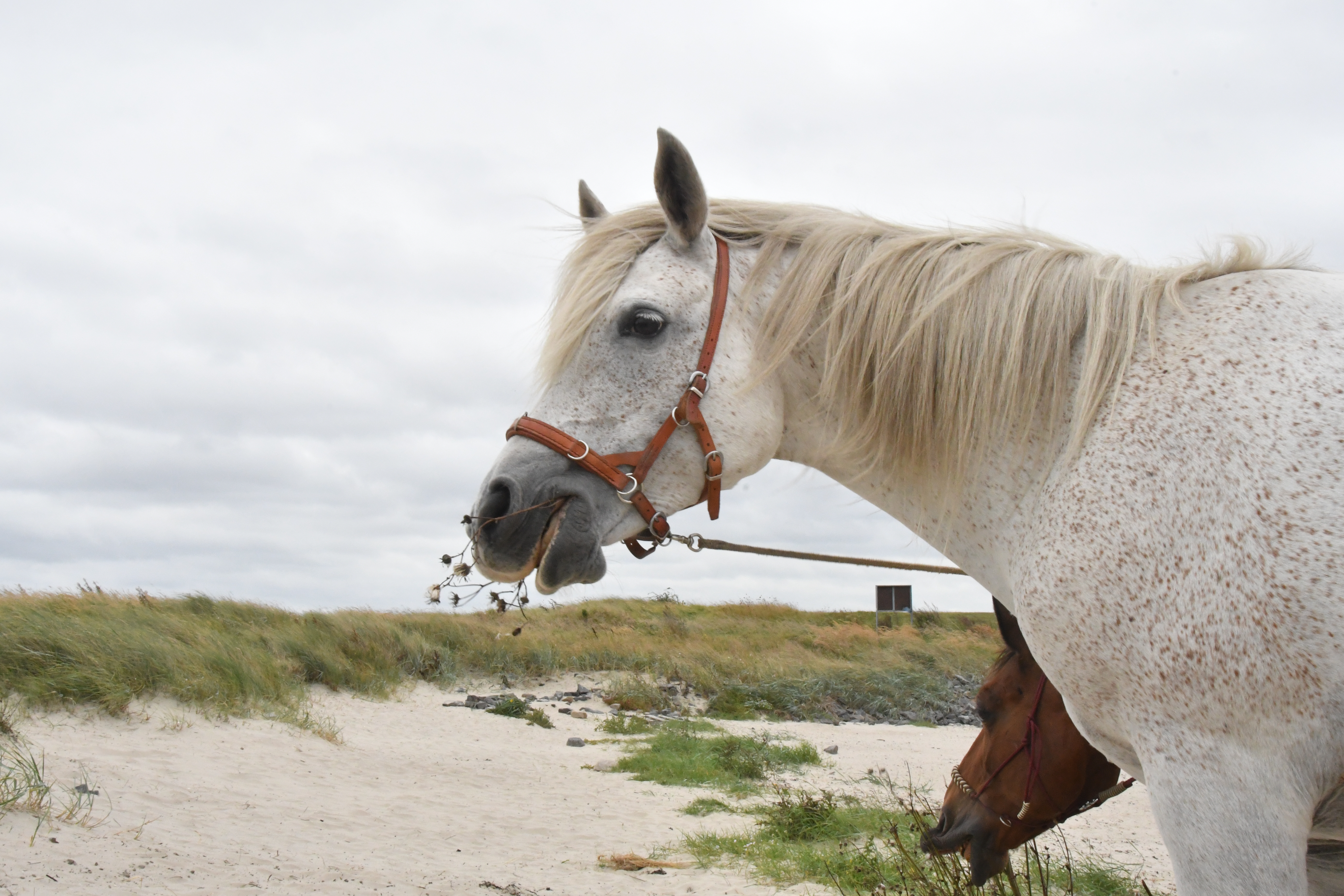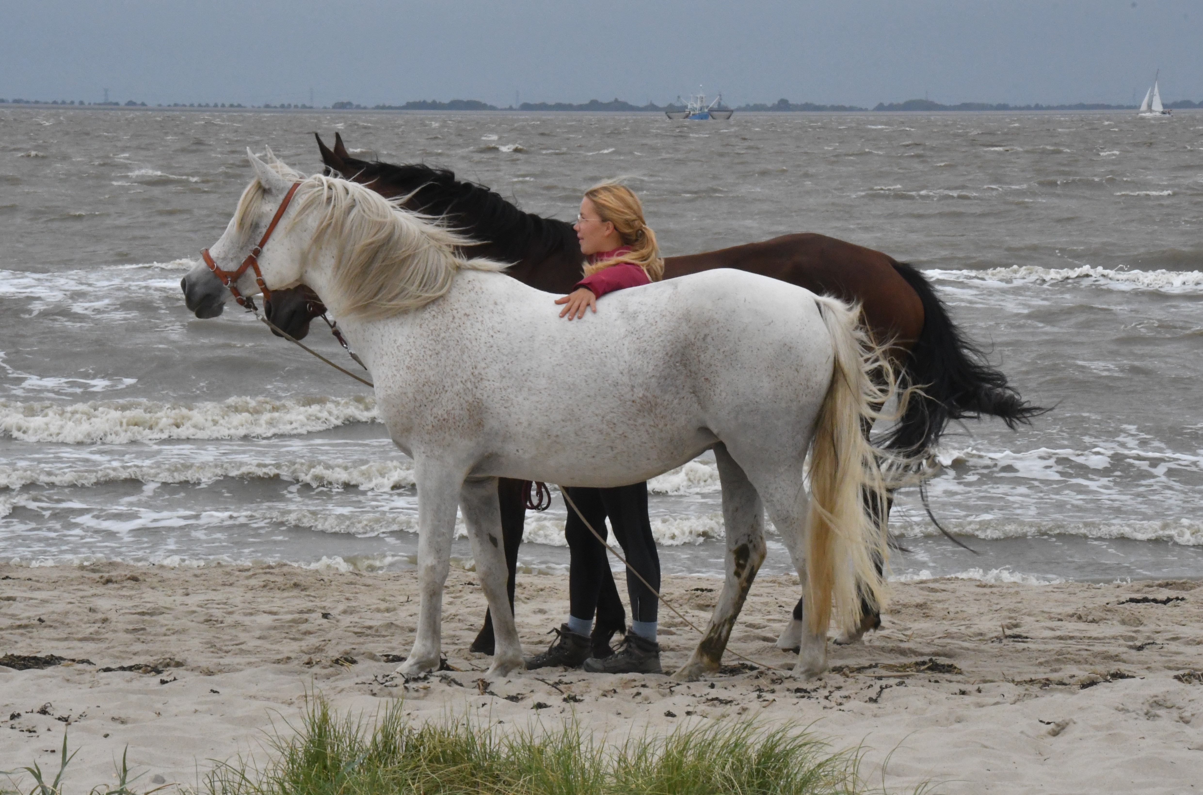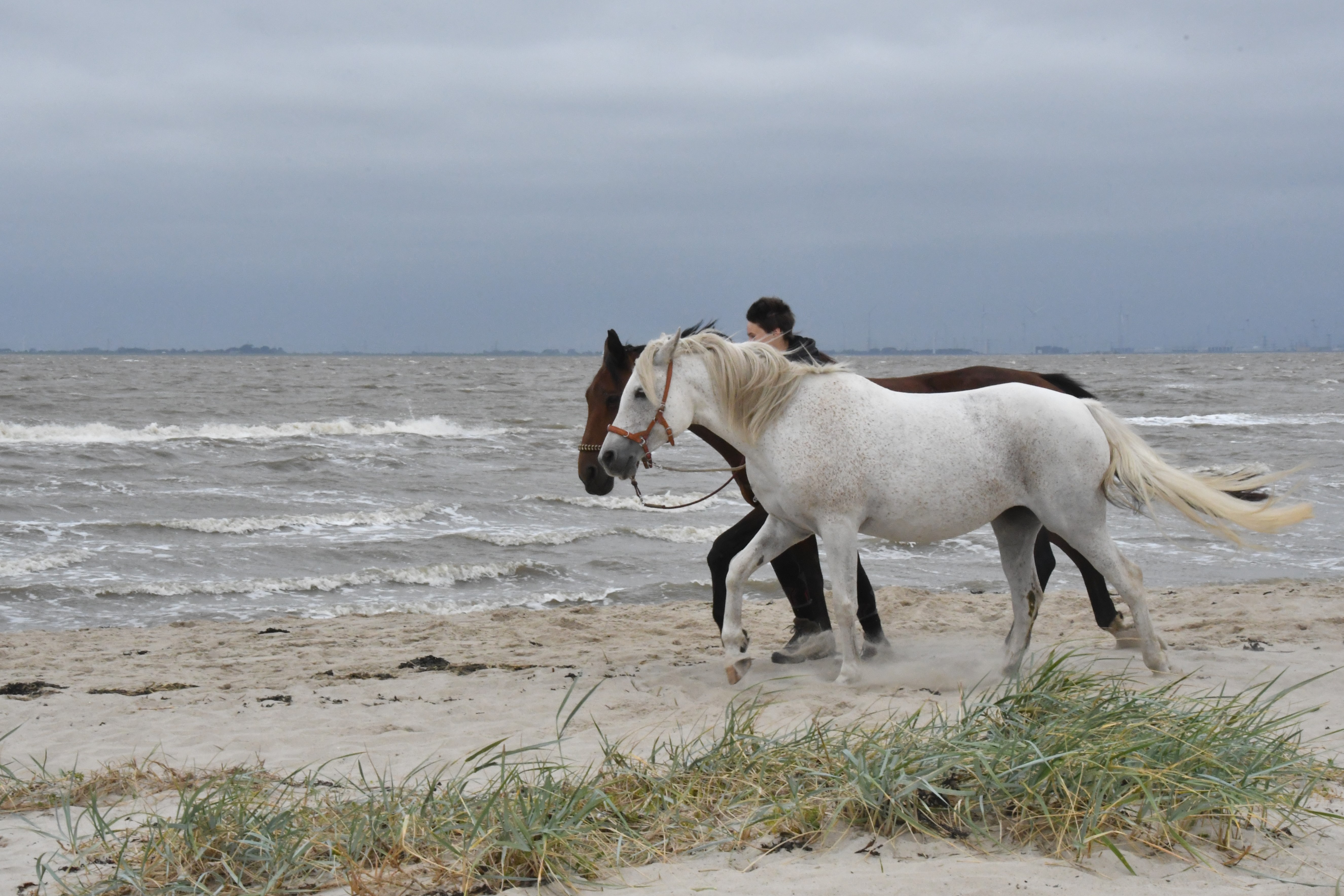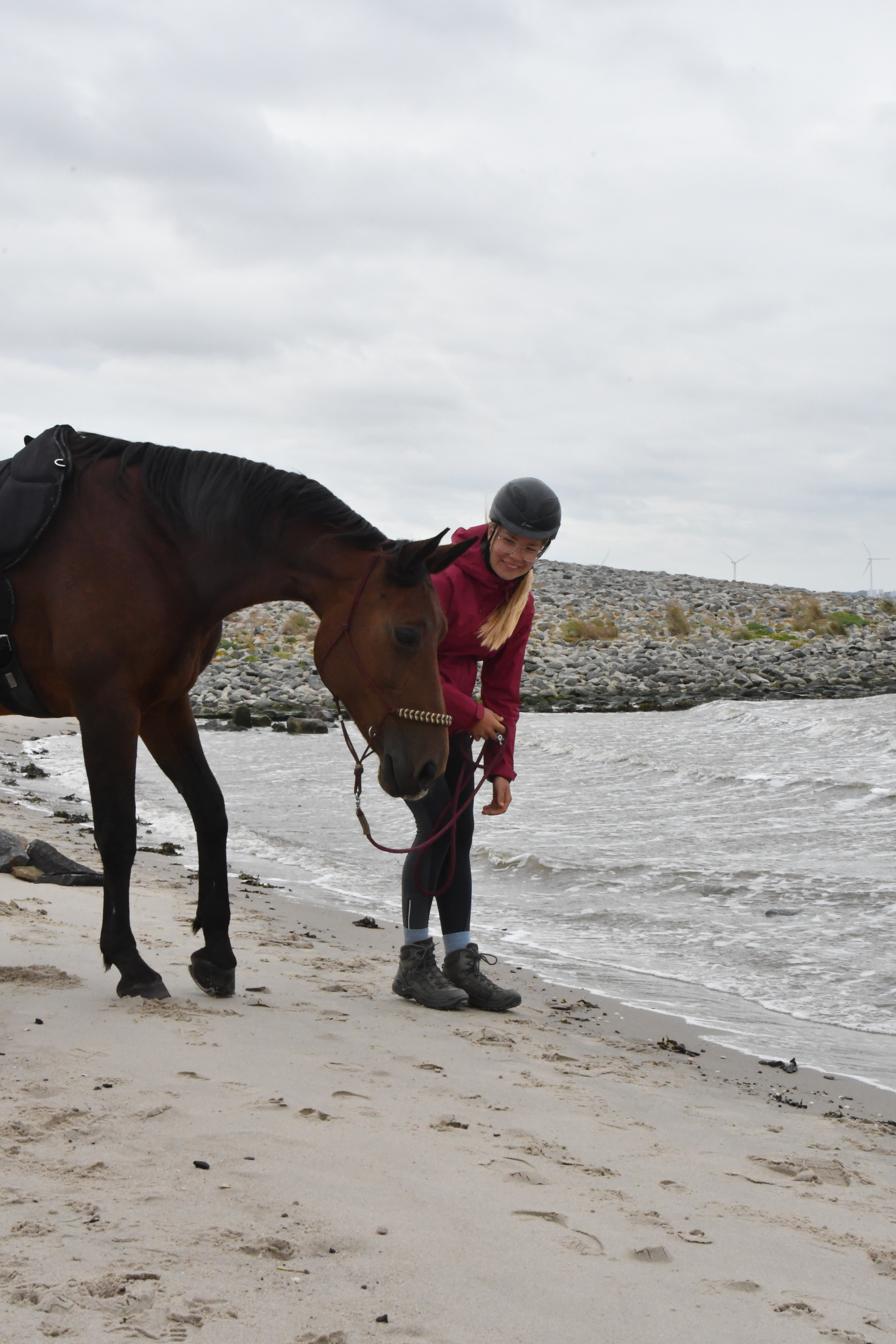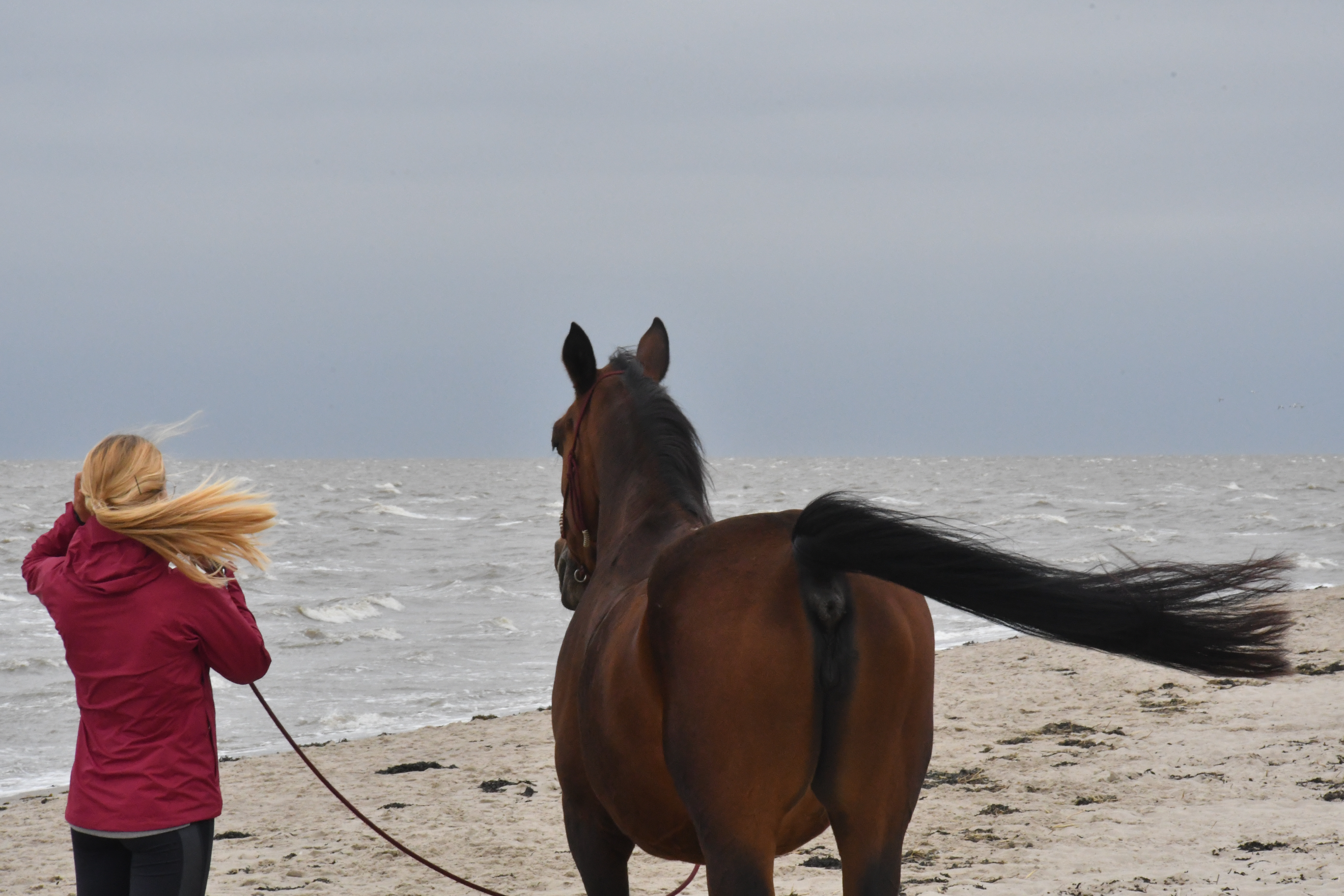 Bei unserer Ankunft entscheiden wir uns den Pferden einen vollen Tag Pause auf der Wiese zu geben, bevor wir ihnen Strand und Meer zeigen. Stattdessen fahren wir am Mittwoch selbst mit unseren Fahrrädern vom Stall an die See und suchen dabei nach dem möglichst kürzesten Weg für die Pferde. Wir sind froh um die Entscheidung, denn es ist schwieriger als gedacht ans Wasser zu kommen: Der Großteil der Deiche sind umzäunt und nur über einen kleinen Holzüberstieg zu erreichen. Darüber hinaus gibt es generell nur sehr sehr wenig Sandstrand. Die Knock, bzw. der Strand, ist gefühlt 100m lang, ein Witz zu unserer Vorstellung dort richtig ausreiten zu können. Aber Strand ist Strand! Als wir mit beiden schließlich am Donnerstag den Strand besuchen, sind sie deutlich munterer im Vergleich zum Vortag und wir finden schnell den richtigen Weg. Wir sind froh genau so die Entscheidung getroffen haben und endlich hier zu sein.