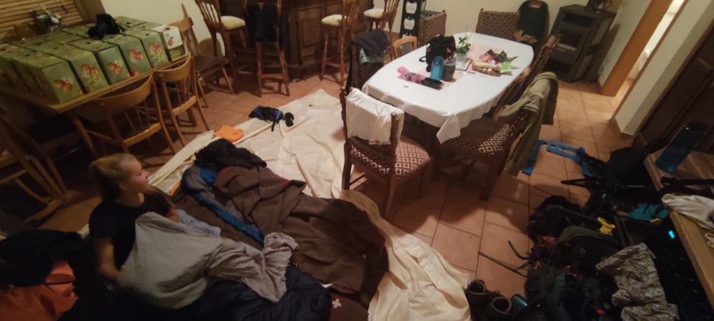 Inzwischen hat die ältere Dame schon etwas mehr Vertrauen zu uns gefasst. Sie realisiert, dass es draußen, selbst in der Garage, zu kalt zum Übernachten ist und bietet uns ihren Vorraum/Waschküche an. Wir sind überglücklich und bedanken uns mehrmals. Die Dame geht schlafen und wir richten uns ein bisschen ein, spielen noch zwei Runden Skipbo und gehen dann ebenfalls schlafen.
