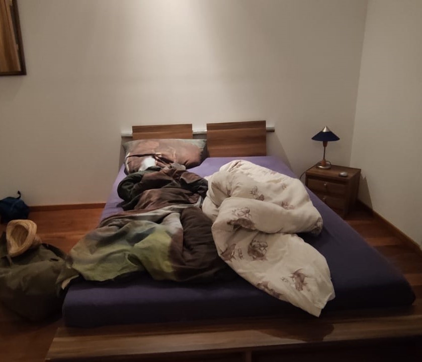 Wir wachen am nächsten Morgen auf, packen die Sachen. Die Dame schläft noch. Wir suchen nach einem Zettel und schreiben ihr ein Dankeschön.